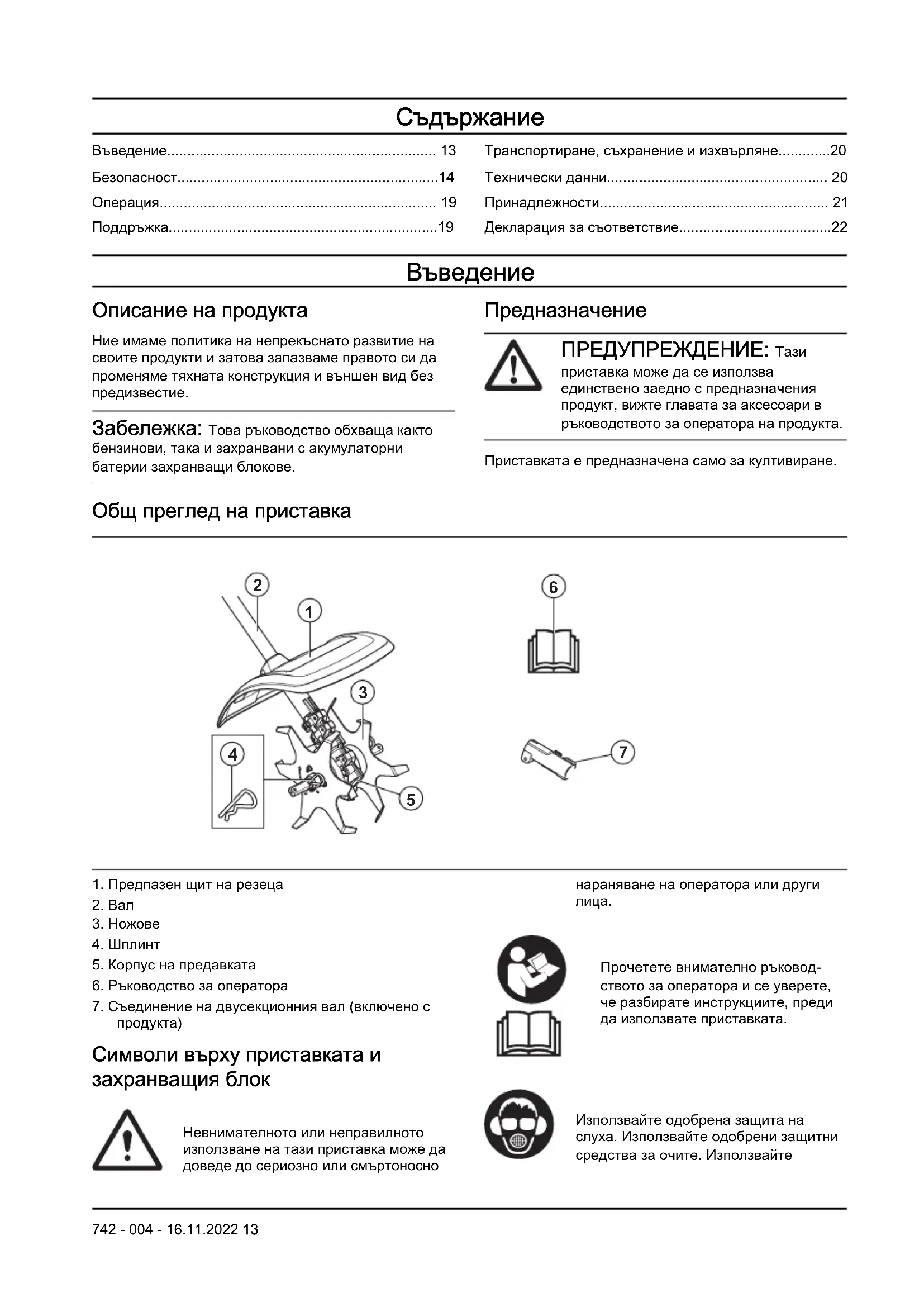 Описание на продукта Ние имаме политика на непрекъснато развитие на своите продукти и затова запазваме правото си да променяме тяхната конструкция и външен вид без предизвестие. Забележка: Това ръководство обхваща както бензинови, така и захранвани с акумулаторни батерии захранващи блокове. Предназначение ПРЕДУПРЕЖДЕНИЕ: Тази приставка може да се използва единствено заедно с предназначения продукт, вижте главата за аксесоари в ръководството за оператора на продукта. Приставката е предназначена само за култивиране. Общ преглед на приставка