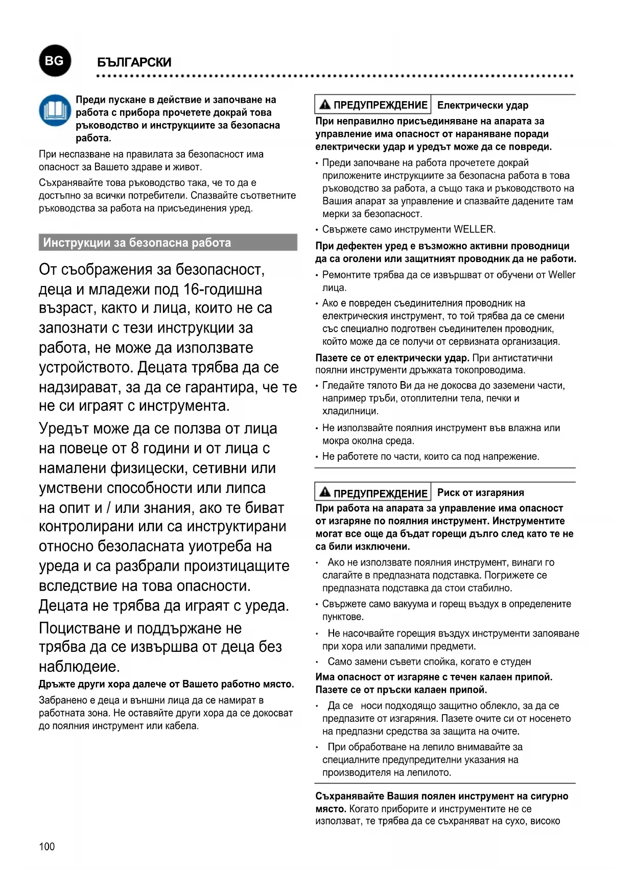 - Не Оставяйте запалителни предмети, течности или газове близо до нагорещения поялен инструмент. Мрежовият кабел може да бъде включван само в разрешените за тази цел мрежови контакти или адаптери. Проверетедалимрежовотонапрежение съвпадасданнитенафирменататабелка.Включвайте уредътвконтактасамовизключеносъстояние. Не използвайте кабела за цели, за които той не е предвиден.Никога не носете прибора за кабела. Не използвайте кабела за изтегляне на щекера от контакта. Пазете кабела от горещина, масло и остри ръбове.. Бъдете внимателни. Внимавайте, какво правите. Работете разумно. Не работете с поялния инструмент, ако не можете да се концентрирате. Избягвайте ненормално положение на тялото. Оформете ергономично правилно Вашето работно място, Внимавайте да стоите удобно при работа, неправилно положение на тялото причинява вреди на здравето. Работете с поялния инструмент само, ако той е в безупречно техническо състояние. Предпазните приспособления не трябва да са деактивирани. Отстранявайте незабавно всички неизправности и дефекти. Преди всяко използване на прибора / инструмента проверете грижливо дали предпазните приспособления работят правилно и в съответствие с предназначението си. Проверете дали подвижните части работят изправно и не се заклещват или дали има повредени части. Всички части трябва да са монтирани правилно и да са изпълнени всички условия, за да се осигури изправната работа на прибора. Използвайте правилния инструмент. Използвайте само принадлежности или допълнителни прибори, които са указани в спецификацията на принадлежностите на ръководството за работа или са разрешени от производителя. Използвайте принадлежности или допълнителни прибори на WELLER само заедно с оригинални прибори на WELLER. Използване на други инструменти и други принадлежности може да стане причина да получите нараняване. Подсигурете инструмента. За закрепване на детайла използвайте затегателни устройства. Използвайте при спояване устройство за изсмукване на дима. Ако има приспособления за присъединяване на устройства за изсмукване на дима, проверете дали те са присъедини и се използват правилно. Използване по предназначение Доставка единица за WELLER WX запояване инструменти. Използвайте станцията за запояване / разпояване / станцията за горещ въздух само в съответствие с дадената в ръководството за работа цел за запояване и разпояване при дадените тук условия. ПРЕДУПРЕЖДЕНИЕ Запалими газове и течности, които не могат да бъдат извлечени. Устройството може да се използва само с правилно монтирани и подходящи филтърни касети. Сменете филтърни касети, когато пълни. Използвайте този уред само при стайна температура и във вътрешни помещения. Да се пази от влага и пряка слънчева светлина. Потребителски групи Поради различни големите рискове и потенциални опасности някои работни операции могат да бъдат извършвани само от квалифициран и обучен персонал. Работна операция Потребителски групи Параметри Default