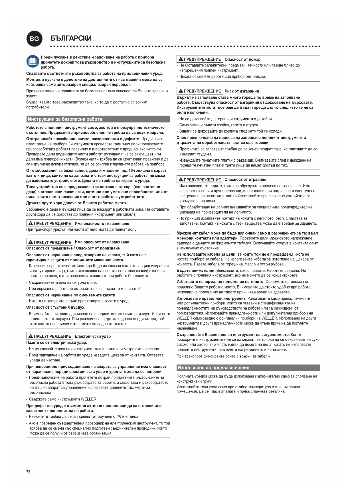 - Попринципизбягвайтеконтактнакожатаслепилото,респ.спастатаза запояване.Контактнакожатастезивеществаможедаевредензаздравето. Мрежовият кабел може да бъде включван само в разрешените за тази цел мрежови контакти или адаптери. Проверете дали мрежовото напрежение съвпада с данните на фирмената табелка. Включвайте уредът в контакта само в изключено състояние. Не използвайте кабела за цели, за които той не е предвиден.Никогане носетеприборазакабела.Неизползвайтекабелазаизтегляненащекераот контакта.Пазетекабелаотгорещина,маслоиостриръбове.. Бъдете внимателни. Внимавайте,каквоправите.Работетеразумно.Не работетеспоялнияинструмент,аконеможетедасеконцентрирате. Избягвайте ненормално положение на тялото. Оформетеергономично правилноВашетоработномясто,Внимавайтедастоитеудобноприработа, неправилноположениенатялотопричиняваврединаздравето. Използвайте правилния инструмент. Използвайтесамопринадлежности илидопълнителниприбори,коитосауказанивспецификациятана принадлежноститенаръководствотозаработаилисаразрешениот производителя.Използвайтепринадлежностиилидопълнителниприборина WELLERсамозаедносоригиналниприборинаWELLER.Използваненадруги инструментиидругипринадлежностиможедастанепричинадаполучите нараняване. Съхранявайте Вашия поялен инструмент на сигурно място.Когато приборитеиинструментитенесеизползват,тетрябвадасесъхраняватнасухо, високоилизаключеномястоизвъндадосеганадеца.Когатонеизползвате поялнитеинструменти,изключетенапрежениетоиналягането. Притранспортфиксирайтеоситесвръзкизакабели. Използване по предназначение Поялнатауредбаможедабъдеизползванаизключителносамозаспояванена конструктивнигрупи. Използвайтетозиуредсамопристайнатемператураивъввътрешни помещения.Дасепазиотвлагаипрякаслънчевасветлина.