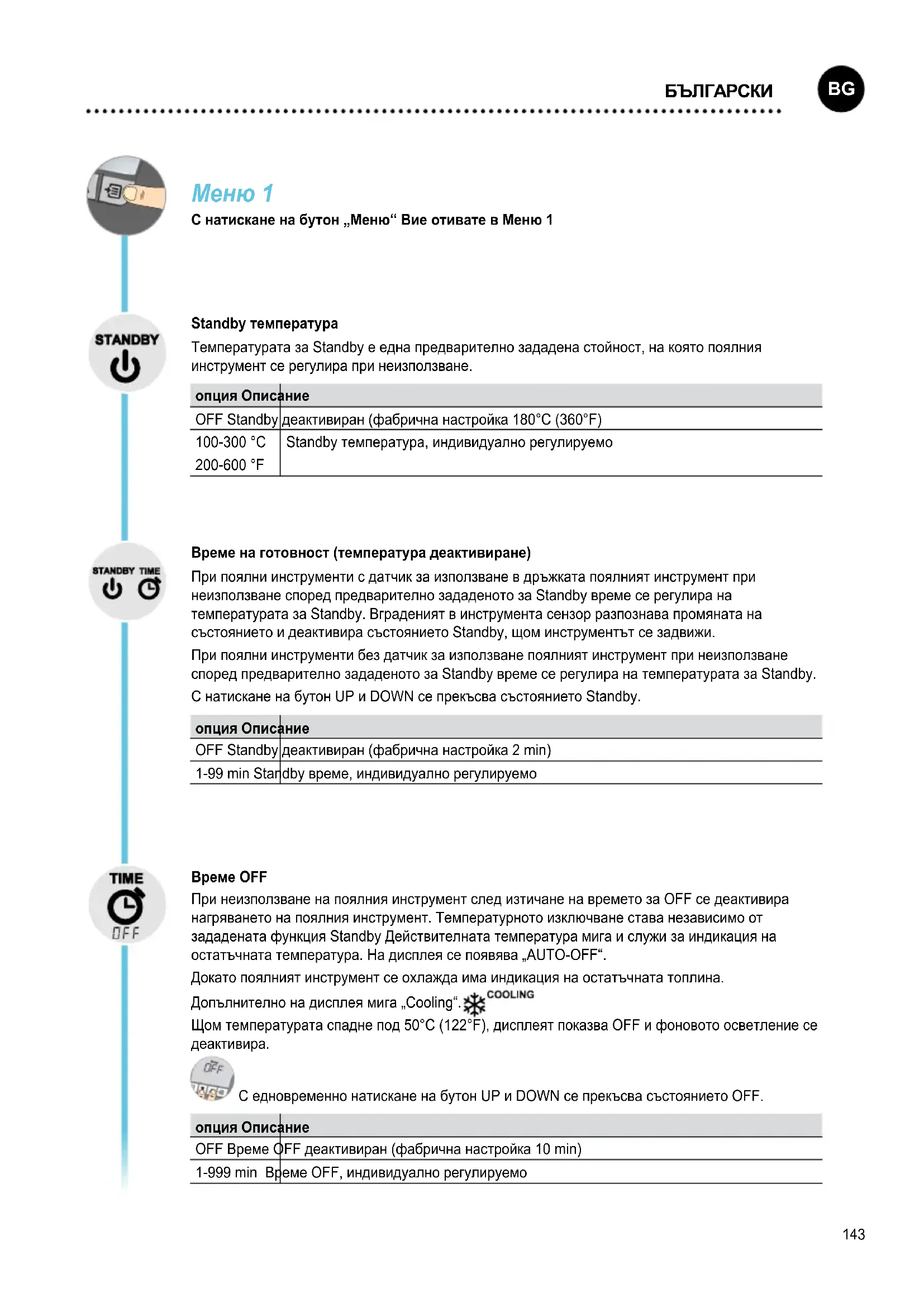 LIETUVIŠKAI143 Меню 1 С натискане на бутон „Меню“ Вие отивате в Меню 1 Standby температура Температурата за Standby е една предварително зададена стойност, на която поялния инструмент се регулира при неизползване. опция Описание OFF Standby деактивиран (фабрична настройка 180°C (360°F) 100-300 °C 200-600 °F Standby температура, индивидуално регулируемо Време на готовност (температура деактивиране) При поялни инструменти с датчик за използване в дръжката поялният инструмент при неизползване според предварително зададеното за Standby време се регулира на температурата за Standby. Вграденият в инструмента сензор разпознава промяната на състоянието и деактивира състоянието Standby, щом инструментът се задвижи. При поялни инструменти без датчик за използване поялният инструмент при неизползване според предварително зададеното за Standby време се регулира на температурата за Standby. С натискане на бутон UP и DOWN се прекъсва състоянието Standby. опция Описание OFF Standby деактивиран (фабрична настройка 2 min) 1-99 min Standby време, индивидуално регулируемо Време OFF При неизползване на поялния инструмент след изтичане на времето за OFF се деактивира нагряването на поялния инструмент. Температурното изключване става независимо от зададената функция Standby Действителната температура мига и служи за индикация на остатъчната температура. На дисплея се появява „AUTO-OFF“. Докато поялният инструмент се охлажда има индикация на остатъчната топлина. Допълнително на дисплея мига „Cooling“. Щом температурата спадне под 50°C (122°F), дисплеят показва OFF и фоновото осветление се деактивира. С едновременно натискане на бутон UP и DOWN се прекъсва състоянието OFF. опция Описание OFF Време OFF деактивиран (фабрична настройка 10 min) 1-999 min Време OFF, индивидуално регулируемо