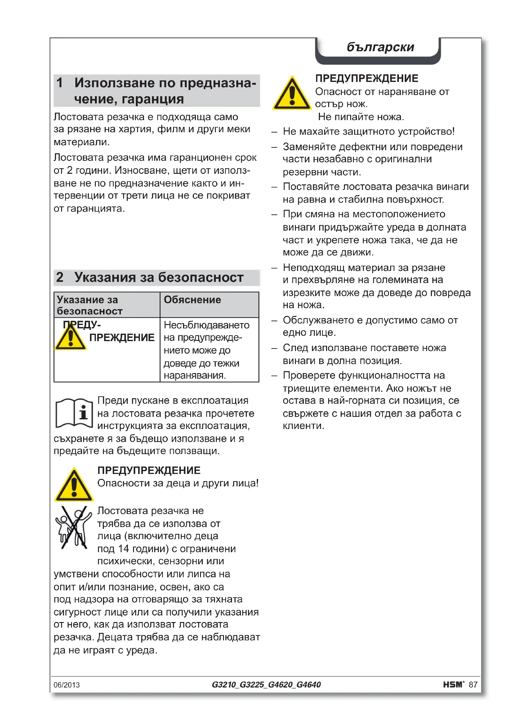 Несъблюдаването на предупрежде- нието може до доведе до тежки наранявания. Преди пускане в експлоатация на лостовата резачка прочетете инструкцията за експлоатация, съхранете я за бъдещо използване и я предайте на бъдещите ползващи. ПРЕДУПРЕЖДЕНИЕ Опасности за деца и други лица! Лостовата резачка не трябва да се използва от лица (включително деца под 14 години) с ограничени психически, сензорни или умствени способности или липса