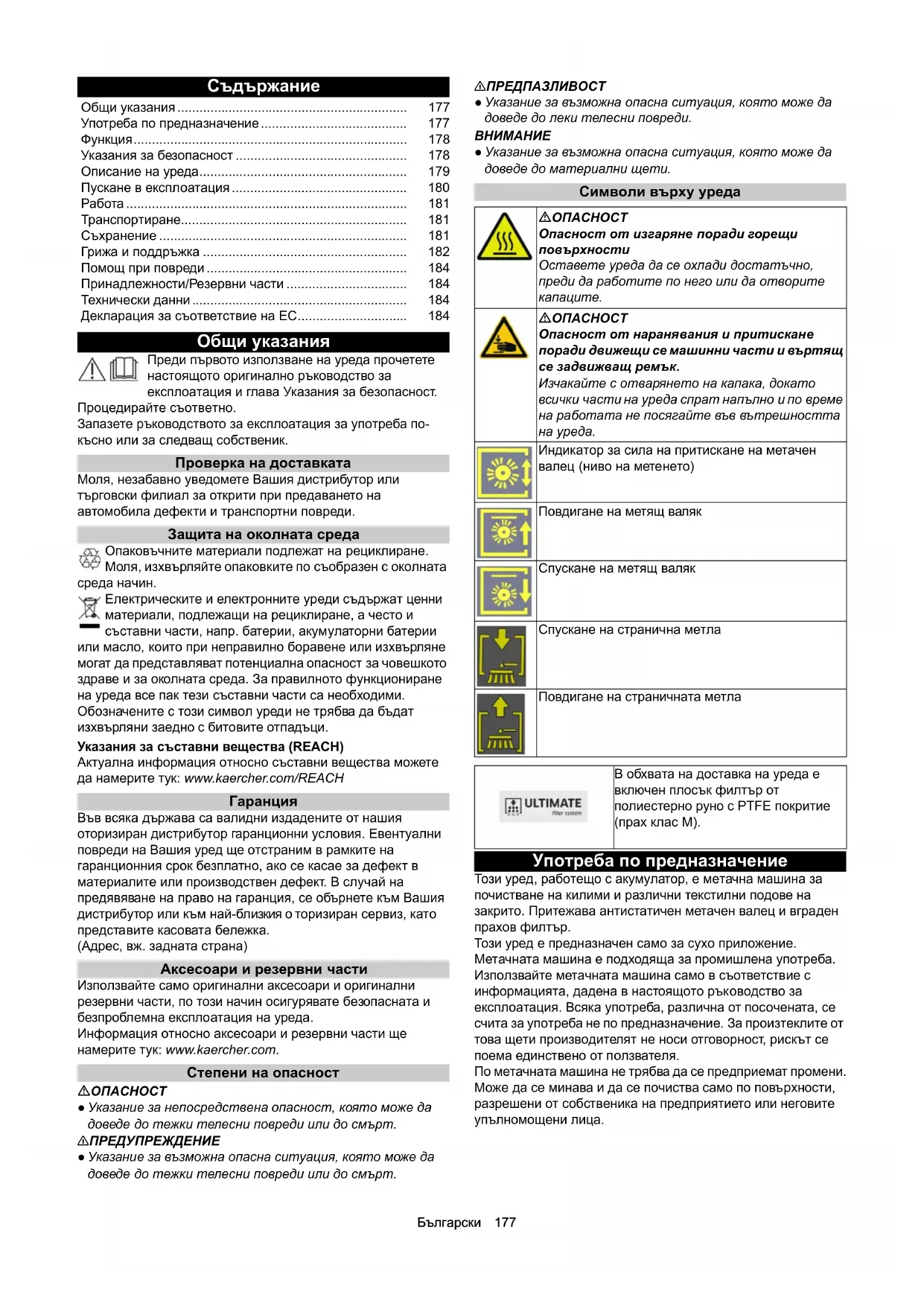 Общи указания Преди първото използване на уреда прочетете настоящото оригинално ръководство за експлоатация и глава Указания за безопасност. Процедирайте съответно. Запазете ръководството за експлоатация за употреба по- късно или за следващ собственик. Проверка на доставката Моля, незабавно уведомете Вашия дистрибутор или търговски филиал за открити при предаването на автомобила дефекти и транспортни повреди. Защита на околната среда Опаковъчните материали подлежат на рециклиране. Моля, изхвърляйте опаковките по съобразен с околната среда начин. Електрическите и електронните уреди съдържат ценни материали, подлежащи на рециклиране, а често и съставни части, напр. батерии, акумулаторни батерии или масло, които при неправилно боравене или изхвърляне могат да представляват потенциална опасност за човешкото здраве и за ок олната среда. За правилното функциониране на уреда все пак тези съставни части са необходими. Обозначените с този символ уреди не трябва да бъдат изхвърляни заедно с битовите отпадъци. Указания за съставни вещества (REACH) Актуална информация относно съставни вещества можете да намерите тук: www.kaercher.com/REACH