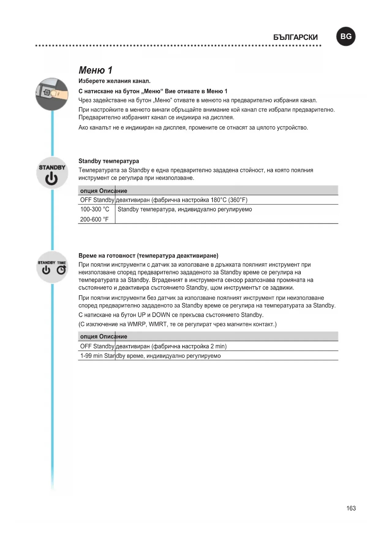 - Patikrinkite sąsajos nustatymus163 Меню 1 Изберете желания канал. С натискане на бутон „Меню“ Вие отивате в Меню 1 Чрез задействане на бутон „Меню“ отивате в менюто на предварително избрания канал. При настройките в менюто винаги обръщайте внимание кой канал сте избрали предварително. Предварително избраният канал се индикира на дисплея. Ако каналът не е индикиран на дисплея, промените се отнасят за цялото устройство. Standby температура Температурата за Standby е една предварително зададена стойност, на която поялния инструмент се регулира при неизползване. опция Описание OFF Standby деактивиран (фабрична настройка 180°C (360°F) 100-300 °C 200-600 °F Standby температура, индивидуално регулируемо Време на готовност (температура деактивиране) При поялни инструменти с датчик за използване в дръжката поялният инструмент при неизползване според предварително зададеното за Standby време се регулира на температурата за Standby. Вграденият в инструмента сензор разпознава промяната на състоянието и деактивира състоянието Standby, щом инструментът се задвижи. При поялни инструменти без датчик за използване поялният инструмент при неизползване според предварително зададеното за Standby време се регулира на температурата за Standby. С натискане на бутон UP и DOWN се прекъсва състоянието Standby. (С изключение на WMRP, WMRT, те се регулират чрез магнитен контакт.) опция Описание OFF Standby деактивиран (фабрична настройка 2 min) 1-99 min Standby време, индивидуално регулируемо