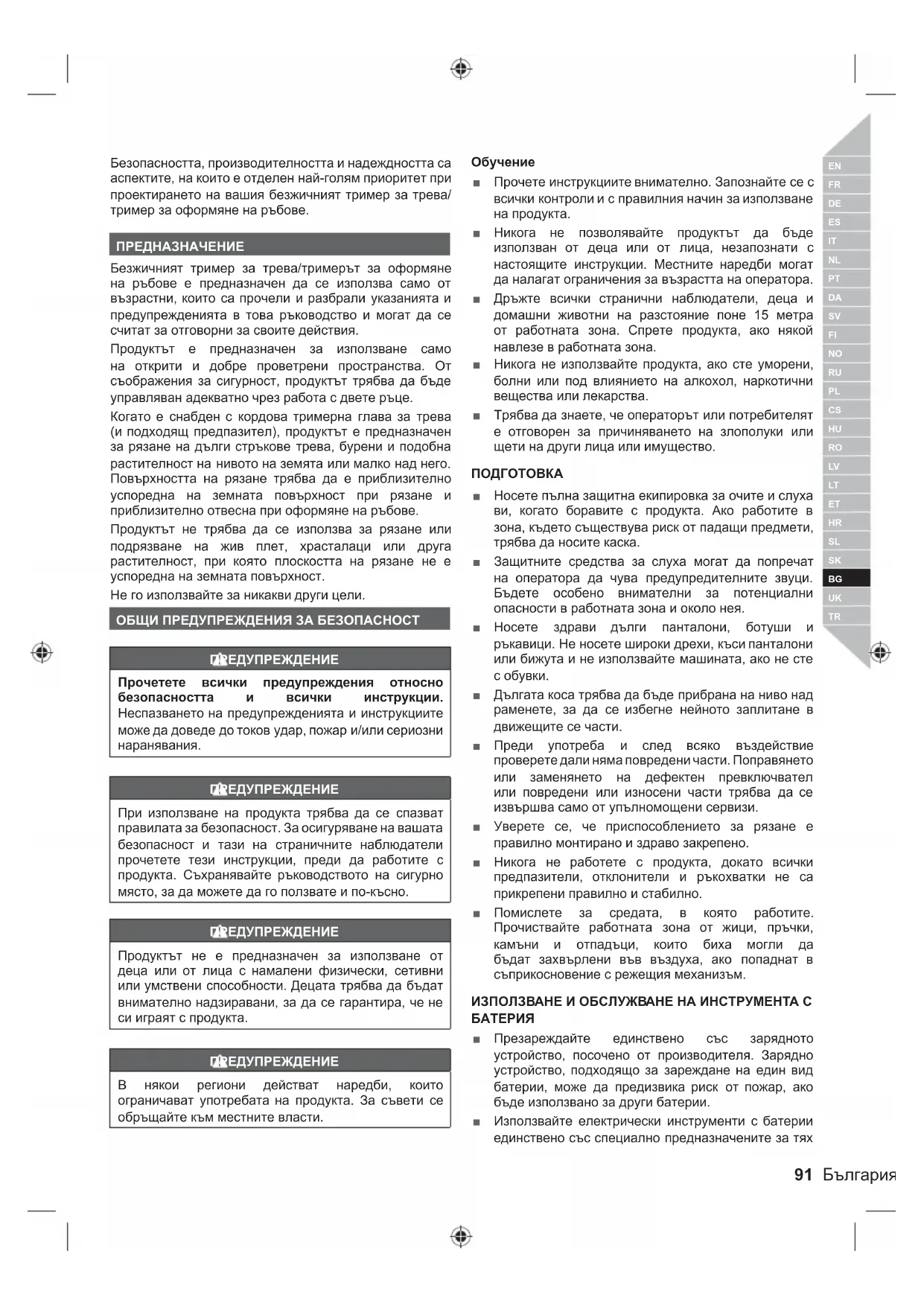 Безопасността, производителността и надеждността са аспектите, на които е отделен най-голям приоритет при проектирането на вашия безжичният тример за трева/ тример за оформяне на ръбове. ПРЕДНАЗНАЧЕНИЕ Безжичният тример за трева/тримерът за оформяне на ръбове е предназначен да се използва само от възрастни, които са прочели и разбрали указанията и предупрежденията в това ръководство и могат да се считат за отговорни за своите действия. Продуктът е предназначен за използване само на открити и добре проветрени пространства. От съображения за сигурност, продуктът трябва да бъде управляван адекватно чрез работа с двете ръце. Когато е снабден с кордова тримерна глава за трева (и подходящ предпазител), продуктът е предназначен за рязане на дълги стръкове трева, бурени и подобна растителност на нивото на земята или малко над него. Повърхността на рязане трябва да е приблизително успоредна на земната повърхност при рязане и приблизително отвесна при оформяне на ръбове. Продуктът не трябва да се използва за рязане или подрязване на жив плет, храсталаци или друга растителност, при която плоскостта на рязане не е успоредна на земната повърхност. Не го използвайте за никакви други цели. ОБЩИ ПРЕДУПРЕЖДЕНИЯ ЗА БЕЗОПАСНОСТ ПРЕДУПРЕЖДЕНИЕ Прочетете всички предупреждения относно безопасността и всички инструкции. Неспазването на предупрежденията и инструкциите може да доведе до токов удар, пожар и/или сериозни наранявания. ПРЕДУПРЕЖДЕНИЕ При използване на продукта трябва да се спазват правилата за безопасност. За осигуряване на вашата безопасност и тази на страничните наблюдатели прочетете тези инструкции, преди да работите с продукта. Съхранявайте ръководството на сигурно място, за да можете да го ползвате и по-късно. ПРЕДУПРЕЖДЕНИЕ Продуктът не е предназначен за използване от деца или от лица с намалени физически, сетивни или умствени способности. Децата трябва да бъдат внимателно надзиравани, за да се гарантира, че не си играят с продукта. ПРЕДУПРЕЖДЕНИЕ В някои региони действат наредби, които ограничават употребата на продукта. За съвети се обръщайте към местните власти.