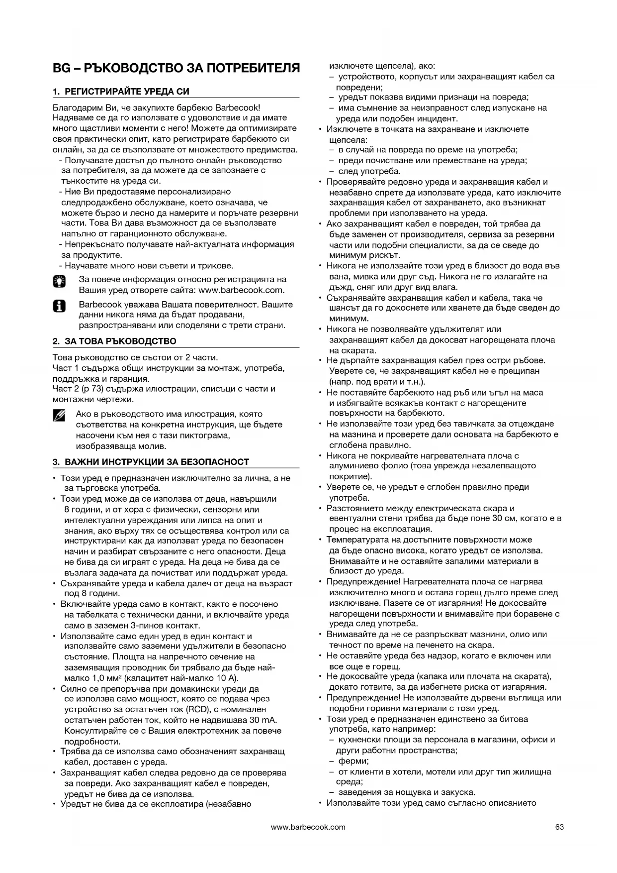 Благодарим Ви, че закупихте барбекю Barbecook! Надяваме се да го използвате с удоволствие и да имате много щастливи моменти с него! Можете да оптимизирате своя практически опит, като регистрирате барбекюто си онлайн, за да се възползвате от множеството предимства. - Получавате достъп до пълното онлайн ръководство за потребителя, за да можете да се запознаете с тънкостите на уреда си. - Ние Ви предоставяме персонализирано следпродажбено обслужване, което означава, че можете бързо и лесно да намерите и поръчате резервни части. Това Ви дава възможност да се възползвате напълно от гаранционното обслужване. - Непрекъснато получавате най-актуалната информация за продуктите. - Научавате много нови съвети и трикове. За повече информация относно регистрацията на Вашия уред отворете сайта: www.barbecook.com. Barbecook уважава Вашата поверителност. Вашите данни никога няма да бъдат продавани, разпространявани или споделяни с трети страни.