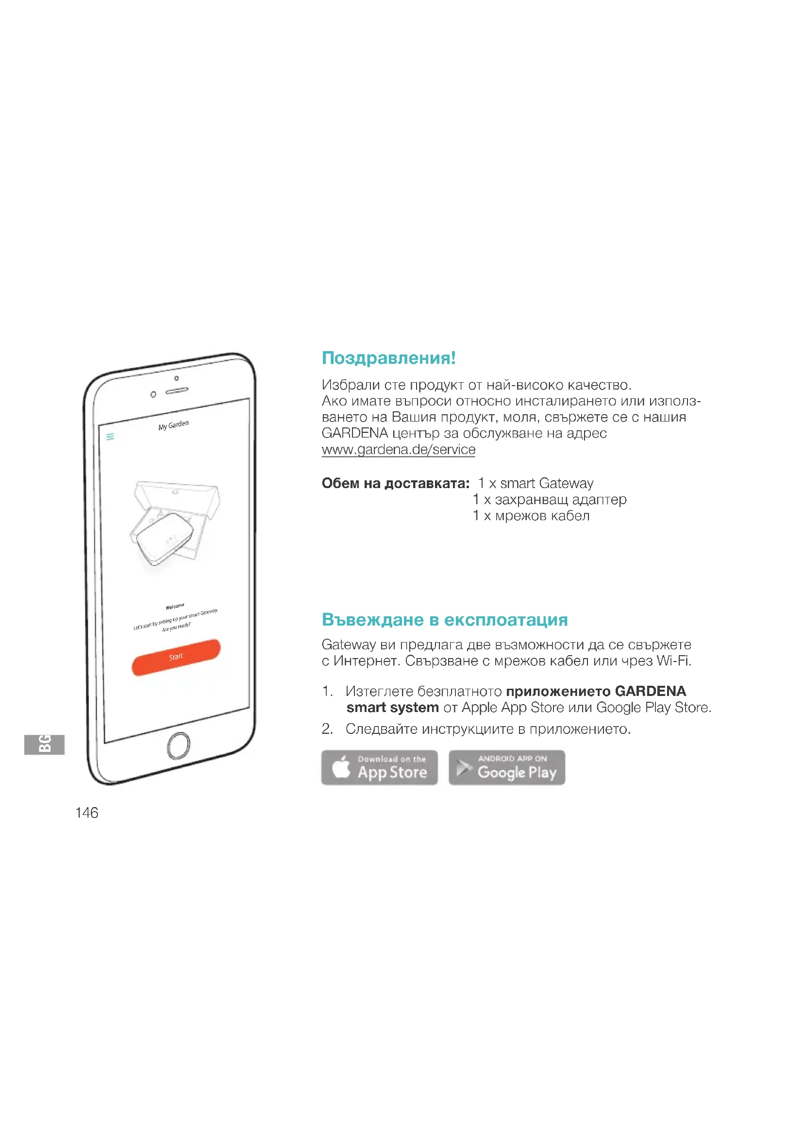 Поздравления! Избрали сте продукт от най-високо качество. Ако имате въпроси относно инсталирането или използ- ването на Вашия продукт, моля, свържете се с нашия GARDENA център за обслужване на адрес www.gardena.de/service Обем на доставката: 1 x smart Gateway 1 x захранващ адаптер 1 x мрежов кабел Въвеждане в експлоатация Gateway ви предлага две възможности да се свържете сИнтернет. Свързване с мрежов кабел или чрез Wi-Fi.