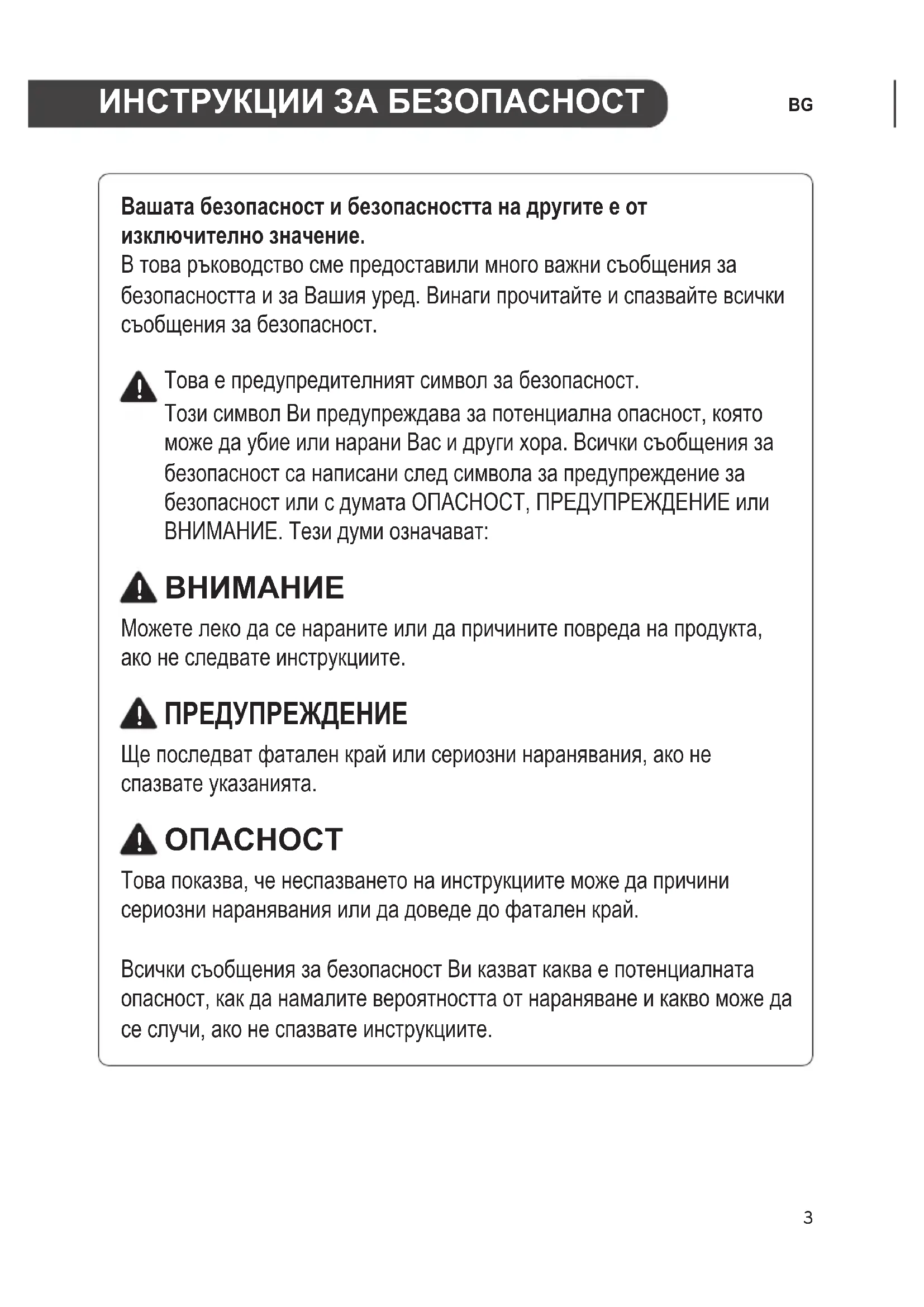 Това показва, че неспазването на инструкциите може да причини сериозни наранявания или да доведе до фатален край. Всички съобщения за безопасност Ви казват каква е потенциалната опасност, как да намалите вероятността от нараняване и какво може да се случи, ако не спазвате инструкциите.