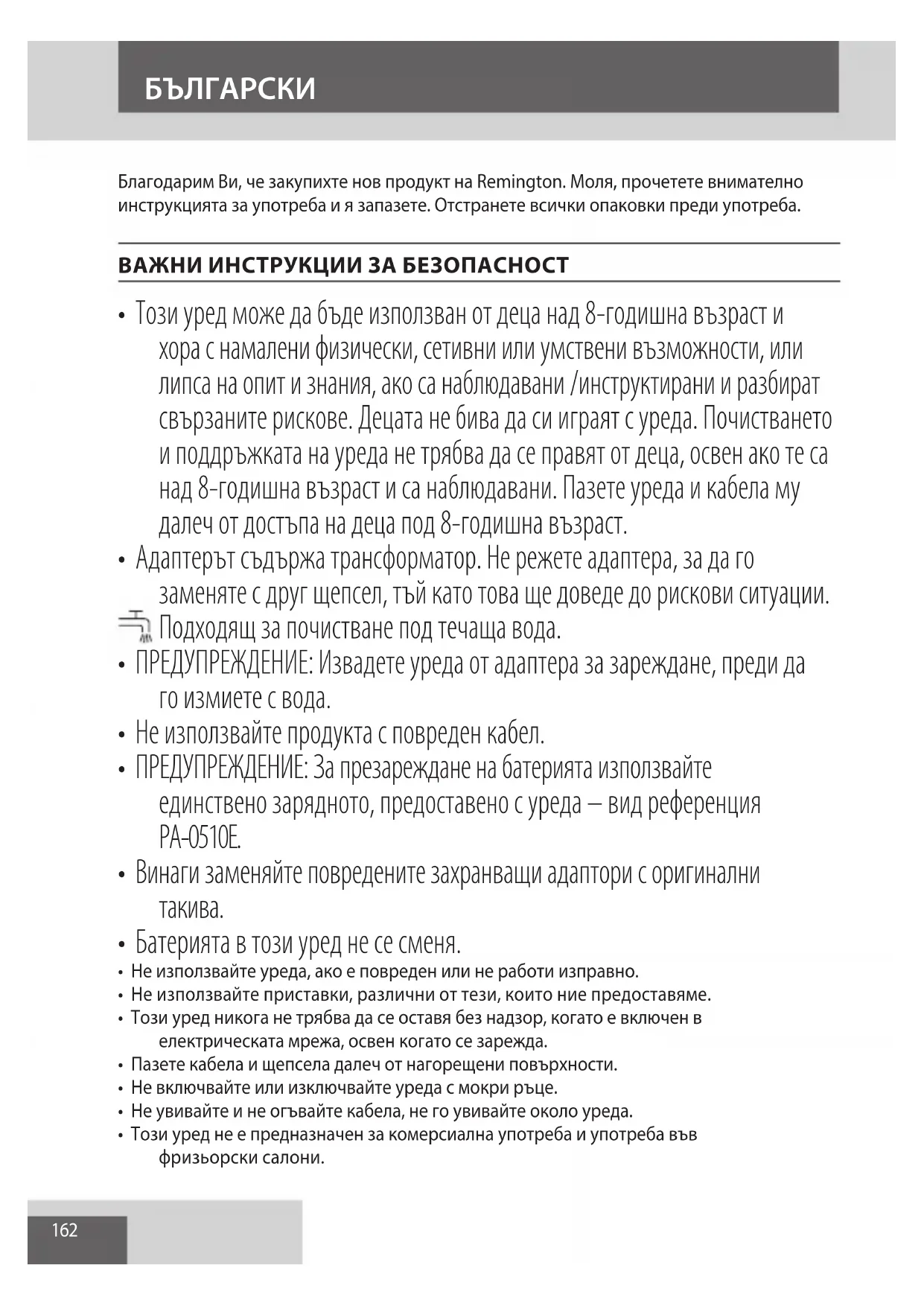 AE162 Благодарим Ви, че закупихте нов продукт на Remington. Моля, прочетете внимателно инструкцията за употреба и я запазете. Отстранете всички опаковки преди употреба. ВАЖНИ ИНСТРУКЦИИ ЗА БЕЗОПАСНОСТ