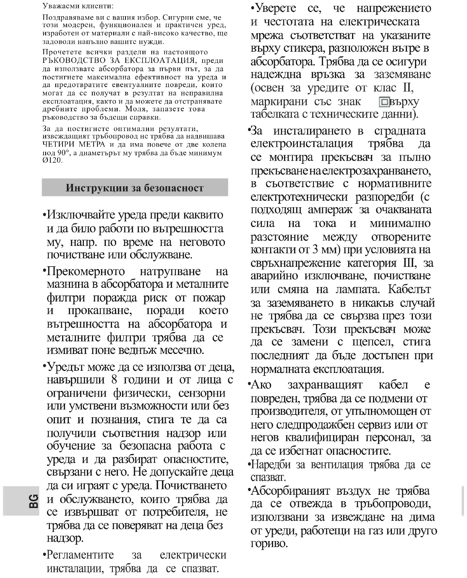 Уважаеми клиенти: Поздравяваме ви с вашия избор. Сигурни сме, че този модерен, функционален и практичен уред, изработен от материали с най-високо качество, ще задоволи напълно вашите нужди. Прочетете всички раздели на настоящото РЪКОВОДСТВО ЗА ЕКСПЛОАТАЦИЯ, преди да използвате абсорбатора за първи път, за да постигнете максимална ефективност на уреда и да предотвратите евентуалните повреди, които могат да се получат в резултат на неправилна експлоатация, както и да можете да отстранявате дребните проблеми. Моля, запазете това ръководство за бъдещи справки. За да постигнете оптимални резултати, извеждащият тръбопровод не трябва да надвишава ЧЕТИРИ МЕТРА и да има повече от две колена под 90°, а диаметърът му трябва да бъде минимум Ø120.