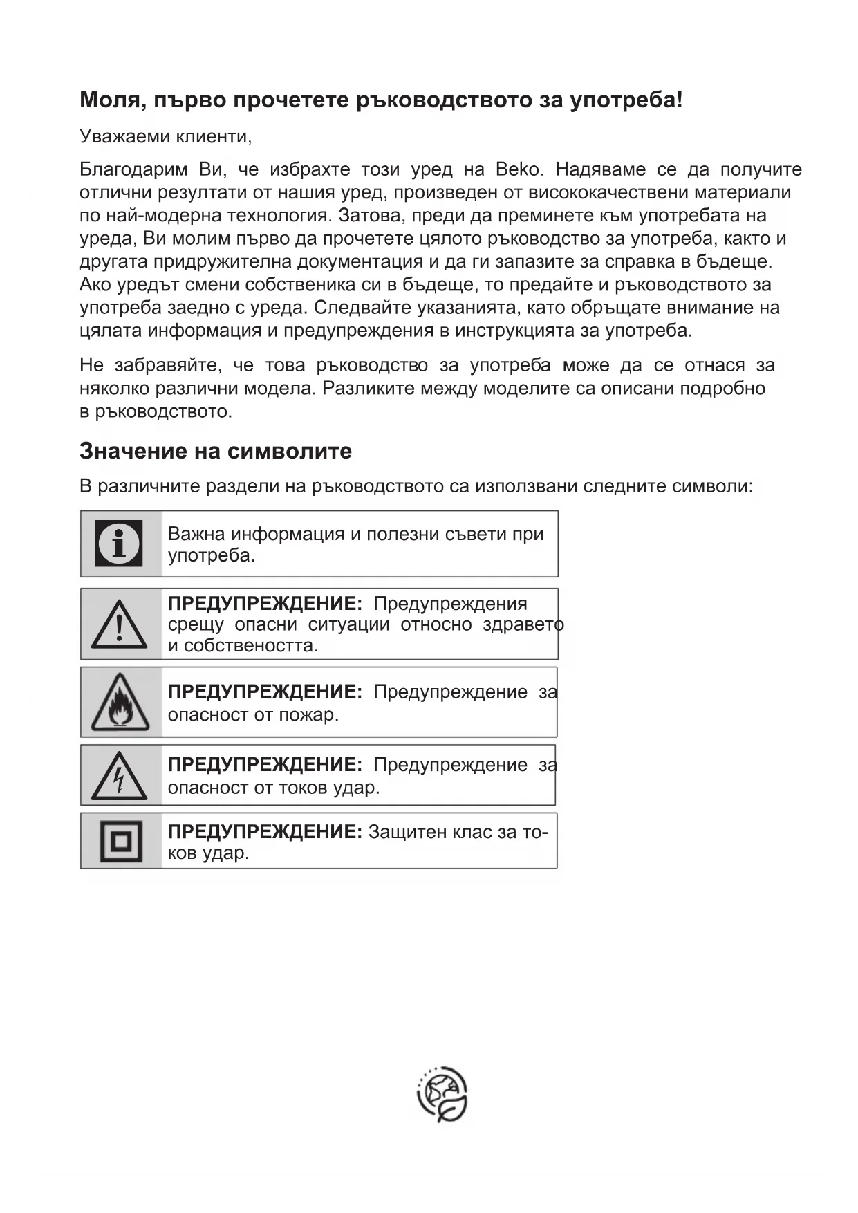 - Продуктите Beko съ- ответстват на прило- жимите стандарти за безопасност; ето защо, в случай на повреда по уреда или захранващия кабел, той трябва да бъде ремонтиран или сменен от дилър, сер- визен център или спе- циалист и оторизиран сервиз с цел избягване на всякакви опасности. Погрешен или неквали- фициран ремонт може да доведе до опасност и риск за потребителя.
