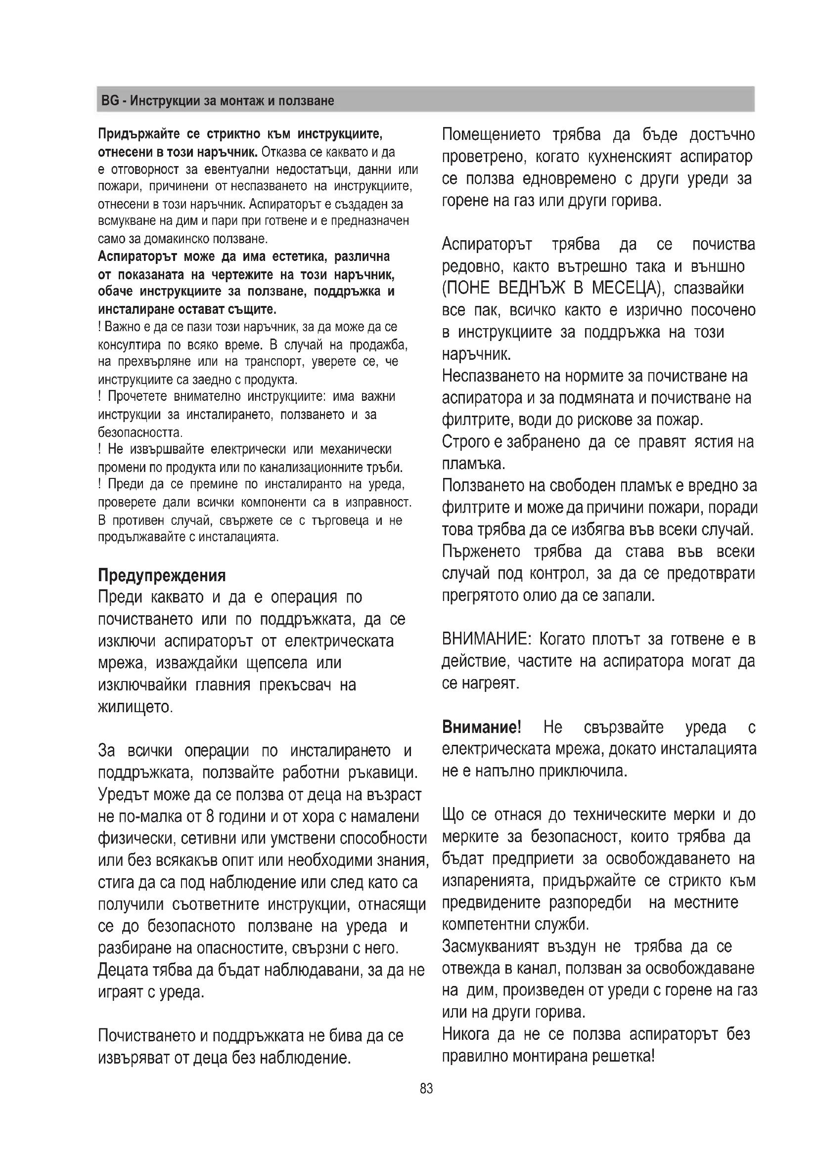За всички операции по инсталирането и поддръжката, ползвайте работни ръкавици. Уредът може да се ползва от деца на възраст не по-малкa от 8 години и от хора с намалени физически, сетивни или умствени способности или без всякакъв опит или необходими знания, стига да са под наблюдение или след като са получили съответните инструкции, отнасящи се до безопасното ползване на уреда и разбиране на опасностите, свързни с него. Децата тябва да бъдат наблюдавани, за да не играят с уреда. Почистването и поддръжката не бива да се извъряват от деца без наблюдение. Помещението трябва да бъде достъчно проветрено, когато кухненският аспиратор се ползва едновремено с други уреди за горене на газ или други горива. Аспираторът трябва да се почиства редовно, както вътрешно така и външно (ПОНЕ ВЕДНЪЖ В МЕСЕЦА), спазвайки все пак, всичко както е изрично посочено в инструкциите за поддръжка на този