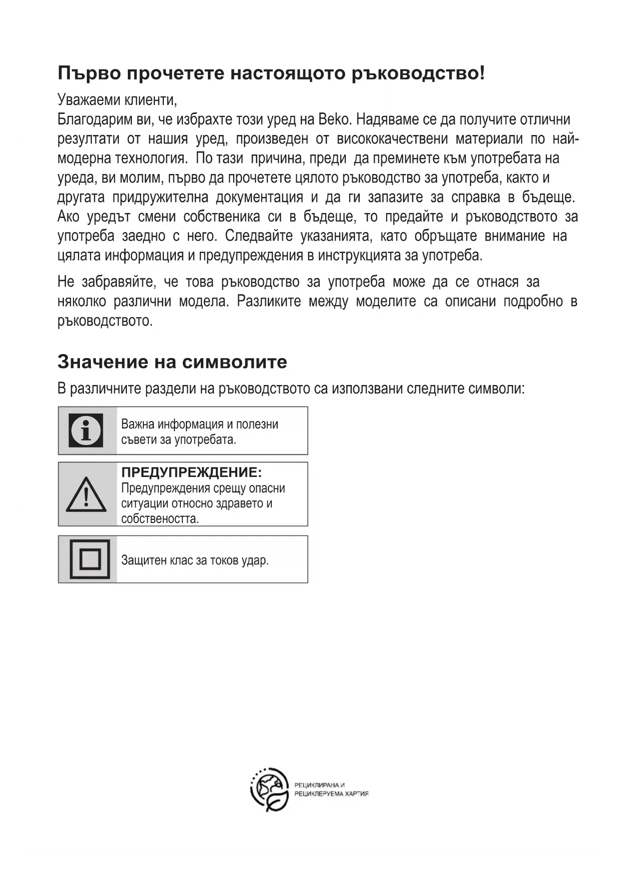- Pokud spotřebič spadne, může přestat fungovat nebo se trvale poškodit. 4 Čištění a péčeПърво прочетете настоящото ръководство! Уважаеми клиенти, Благодарим ви, че избрахте този уред на Beko. Надяваме се да получите отлични резултати от нашия уред, произведен от висококачествени материали по най- модерна технология. По тази причина, преди да преминете към употребата на уреда, ви молим, първо да прочетете цялото ръководство за употреба, както и другата придружителна документация и да ги запазите за справка в бъдеще. Ако уредът смени собственика си в бъдеще, то предайте и ръководството за употреба заедно с него. Следвайте указанията, като обръщате внимание на цялата информация и предупреждения в инструкцията за употреба. Не забравяйте, че това ръководство за употреба може да се отнася за няколко различни модела. Разликите между моделите са описани подробно в ръководството. Значение на символите В различните раздели на ръководството са използвани следните символи: