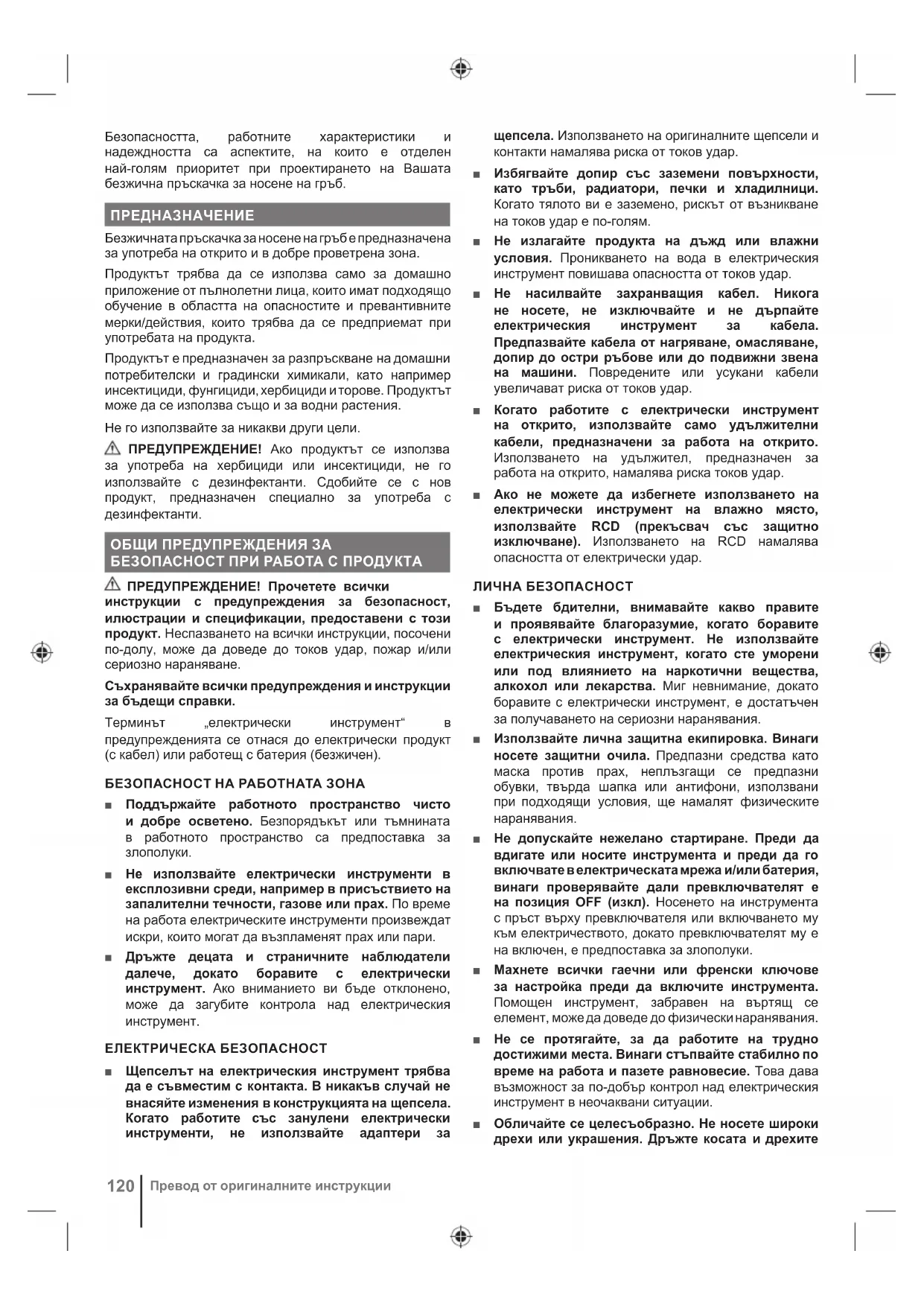 Diely alebo príslušenstvo predávané samostatne Poznámka Varovanie Zamknuté Odomknuté Zastavte zariadenie.120 Превод от оригиналните инструкции Безопасността, работните характеристики и надеждността са аспектите, на които е отделен най-голям приоритет при проектирането на Вашата безжична пръскачка за носене на гръб. ПРЕДНАЗНАЧЕНИЕ Безжичната пръскачка за носене на гръб е предназначена за употреба на открито и в добре проветрена зона. Продуктът трябва да се използва само за домашно приложение от пълнолетни лица, които имат подходящо обучение в областта на опасностите и превантивните мерки/действия, които трябва да се предприемат при употребата на продукта.