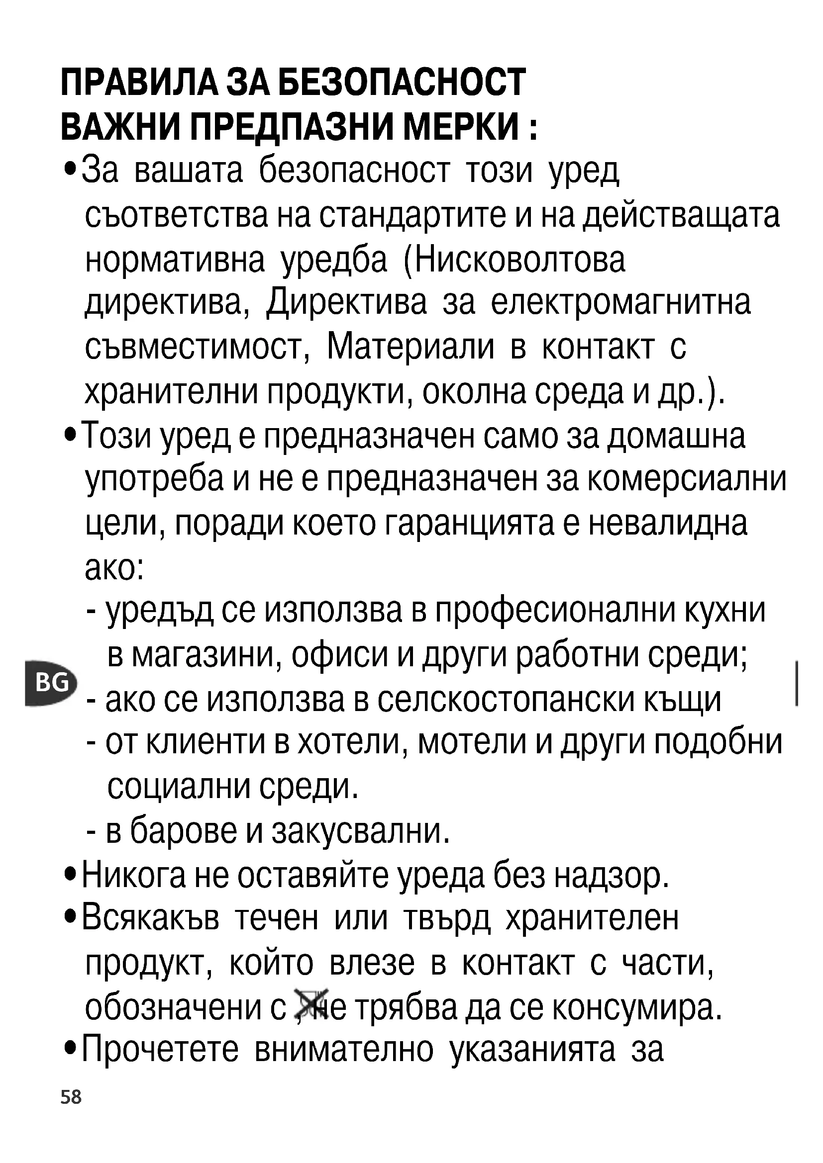 - За вашата безопасност този уред съответства на стандартите и на действащата нормативна уредба (Нисковолтова директива, Директива за електромагнитна съвместимост, Материали в контакт с хранителни продукти, околна среда и др.).