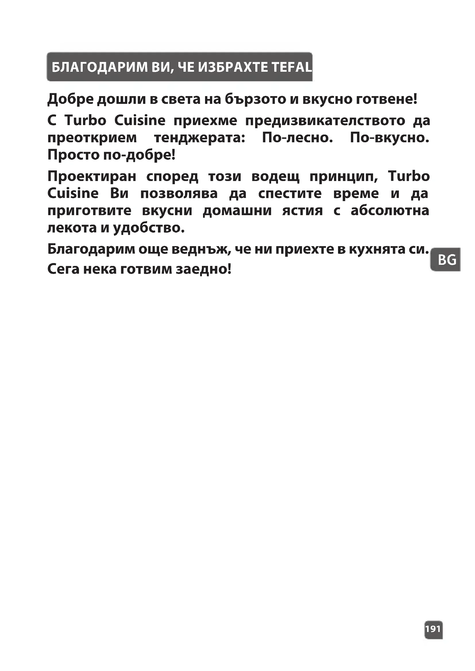 БЛАГОДАРИМ ВИ, ЧЕ ИЗБРАХТЕ TEFAL Добре дошли в света на бързото и вкусно готвене! С Turbo Cuisine приехме предизвикателството да преоткрием тенджерата: По-лесно. По-вкусно. Просто по-добре! Проектиран според този водещ принцип, Turbo Cuisine Ви позволява да спестите време и да приготвите вкусни домашни ястия с абсолютна лекота и удобство. Благодарим още веднъж, че ни приехте в кухнята си. Сега нека готвим заедно!193192