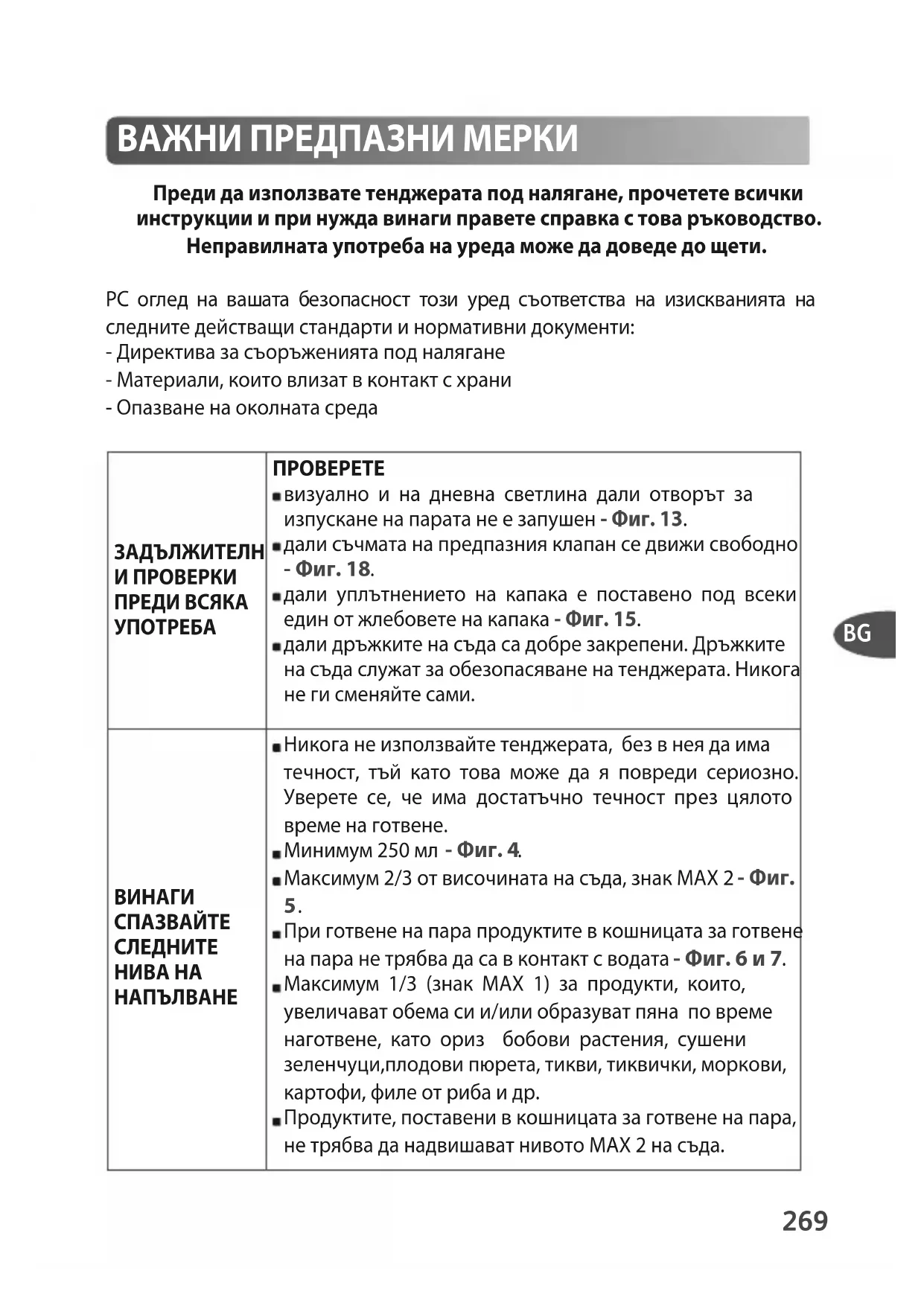 Преди да използвате тенджерата под налягане, прочетете всички инструкции и при нужда винаги правете справка с това ръководство. Неправилната употреба на уреда може да доведе до щети. PС оглед на вашата безопасност този уред съответства на изискванията на следните действащи стандарти и нормативни документи: - Директива за съоръженията под налягане - Материали, които влизат в контакт с храни - Опазване на околната среда ВАЖНИ ПРЕДПАЗНИ МЕРКИ ЗАДЪЛЖИТЕЛН
