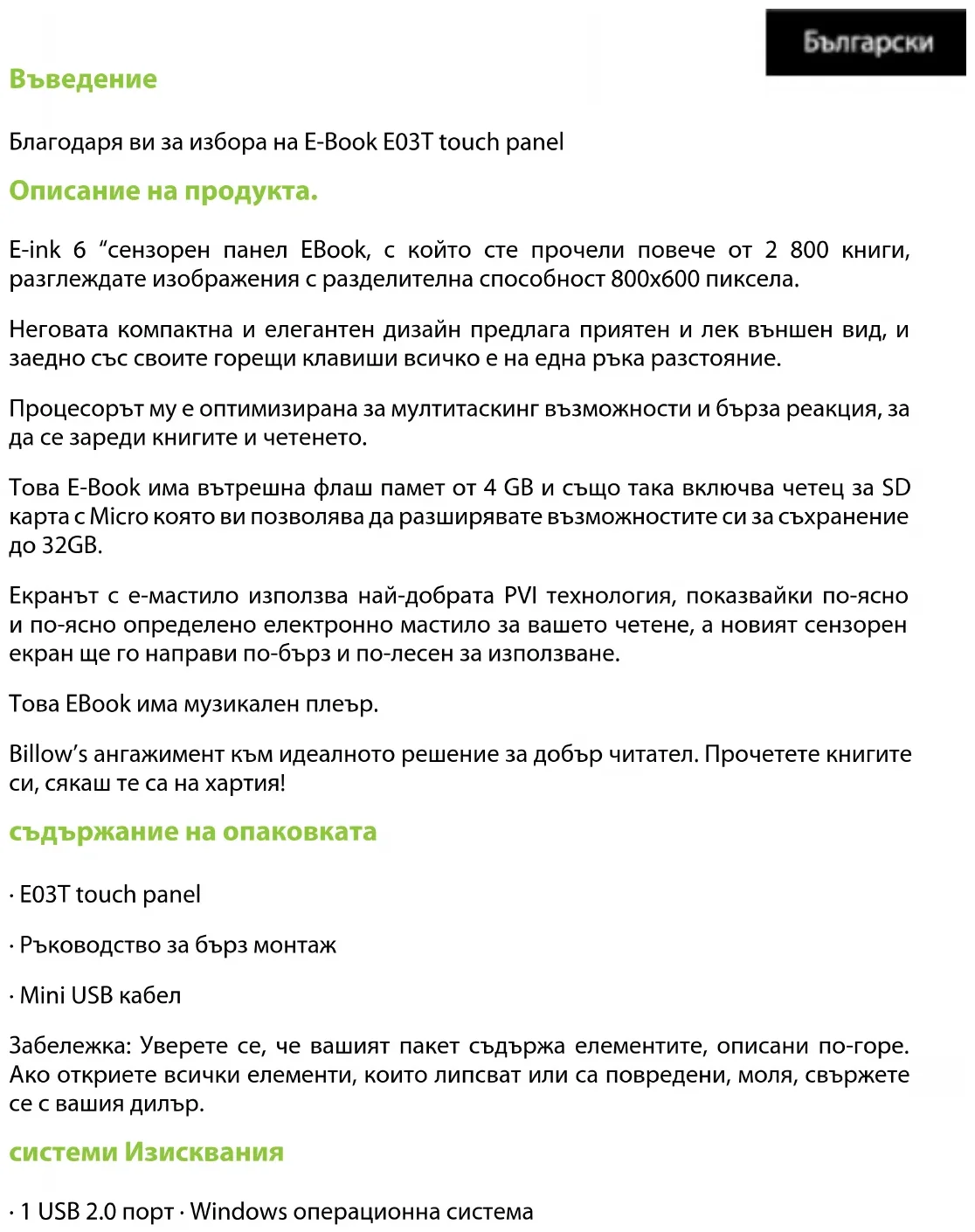 electronic ink ebook-t ouch 06”Въведение Благодаря ви за избора на E-Book E03T touch panel Описание на продукта. E-ink 6 “сензорен панел EBook, с който сте прочели повече от 2 800 книги, разглеждате изображения с разделителна способност 800x600 пиксела. Неговата компактна и елегантен дизайн предлага приятен и лек външен вид, и заедно със своите горещи клавиши всичко е на една ръка разстояние. Процесорът му е оптимизирана за мултитаскинг възможности и бърза реакция, за да се зареди книгите и четенето. Това E-Book има вътрешна флаш памет от 4 GB и също така включва четец за SD карта с Micro която ви позволява да разширявате възможностите си за съхранение до 32GB. Екранът с е-мастило използва най-добрата PVI технология, показвайки по-ясно и по-ясно определено електронно мастило за вашето четене, а новият сензорен екран ще го направи по-бърз и по-лесен за използване. Това EBook има музикален плеър. Billow’s ангажимент към идеалното решение за добър читател. Прочетете книгите си, сякаш те са на хартия! съдържание на опаковката