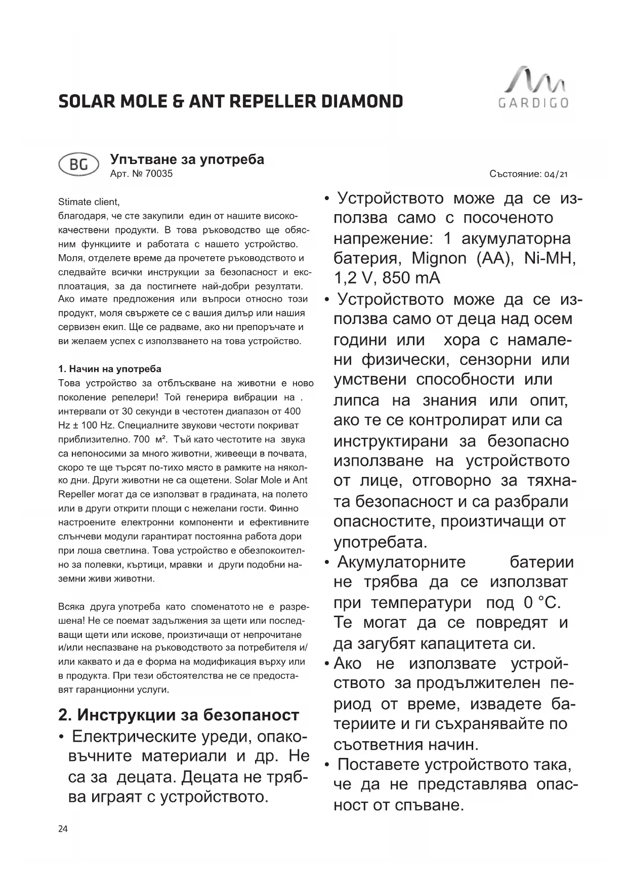 РЪКОВОДСТВО ЗА ПОТРЕБИТЕЛЯ 70035 Gardigo