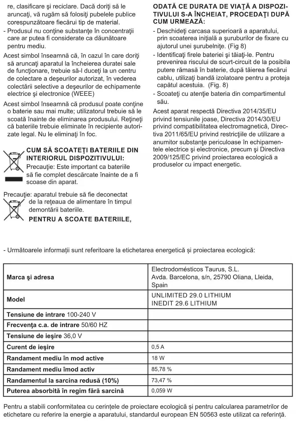 - Безопасно извадете батерията от мястото й. Настоящият уред изпълнява Директива 2014/35/EU за ниски напрежения, Директива 2014/30/EU за електромагнетично съответствие и с Директива 2011/65/ЕU за ограниченията при употреба на някои определени опасни вещества в електрически и електронни апарати и с Директива 2009/125/ EC за изискванията за екологичен дизайн, приложими към изделия, свързани с енергия.- Информацията по-долу се отнася за енергитичното етикиране и екологичния дизайн: Марка и адрес Electrodomésticos Taurus, S.L. Avda. Barcelona, s/n, 25790 Oliana, Lleida, Spain