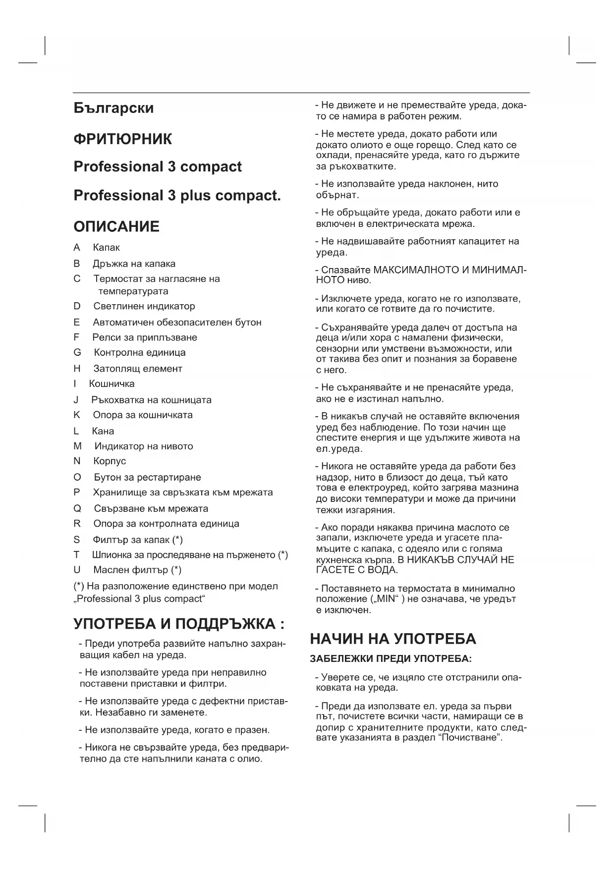 A Капак B Дръжканакапака C Термостатзанагласянена температурата D Светлинениндикатор E Автоматиченобезопасителенбутон F Релсизаприплъзване G Контролнаединица H Затоплящелемент I Кошничка J Ръкохватканакошницата K Опоразакошничката L Кана M Индикаторнанивото N Корпус O Бутонзарестартиране P Хранилищезасвръзкатакъммрежата Q Свързванекъммрежата R Опоразаконтролнатаединица S Филтързакапак(*) T Шпионказапроследяваненапърженето(*) U Масленфилтър(*) (*)Наразположениеединственопримодел „Professional 3 plus compact“ УПОТРЕБА И ПОДДРЪЖКА : - Предиупотребаразвийтенапълнозахран- ващиякабелнауреда. - Неизползвайтеуредапринеправилно поставениприставкиифилтри. - Неизползвайтеуредасдефектнипристав- ки.Незабавногизаменете. - Неизползвайтеуреда,когатоепразен. - Никоганесвързвайтеуреда,безпредвари- телнодастенапълниликанатасолио. - Недвижетеинепремествайтеуреда,дока- тосенамиравработенрежим. - Неместетеуреда,докатоработиили докатоолиотоеощегорещо.Следкатосе охлади,пренасяйтеуреда,катогодържите заръкохватките. - Неизползвайтеуреданаклонен,нито