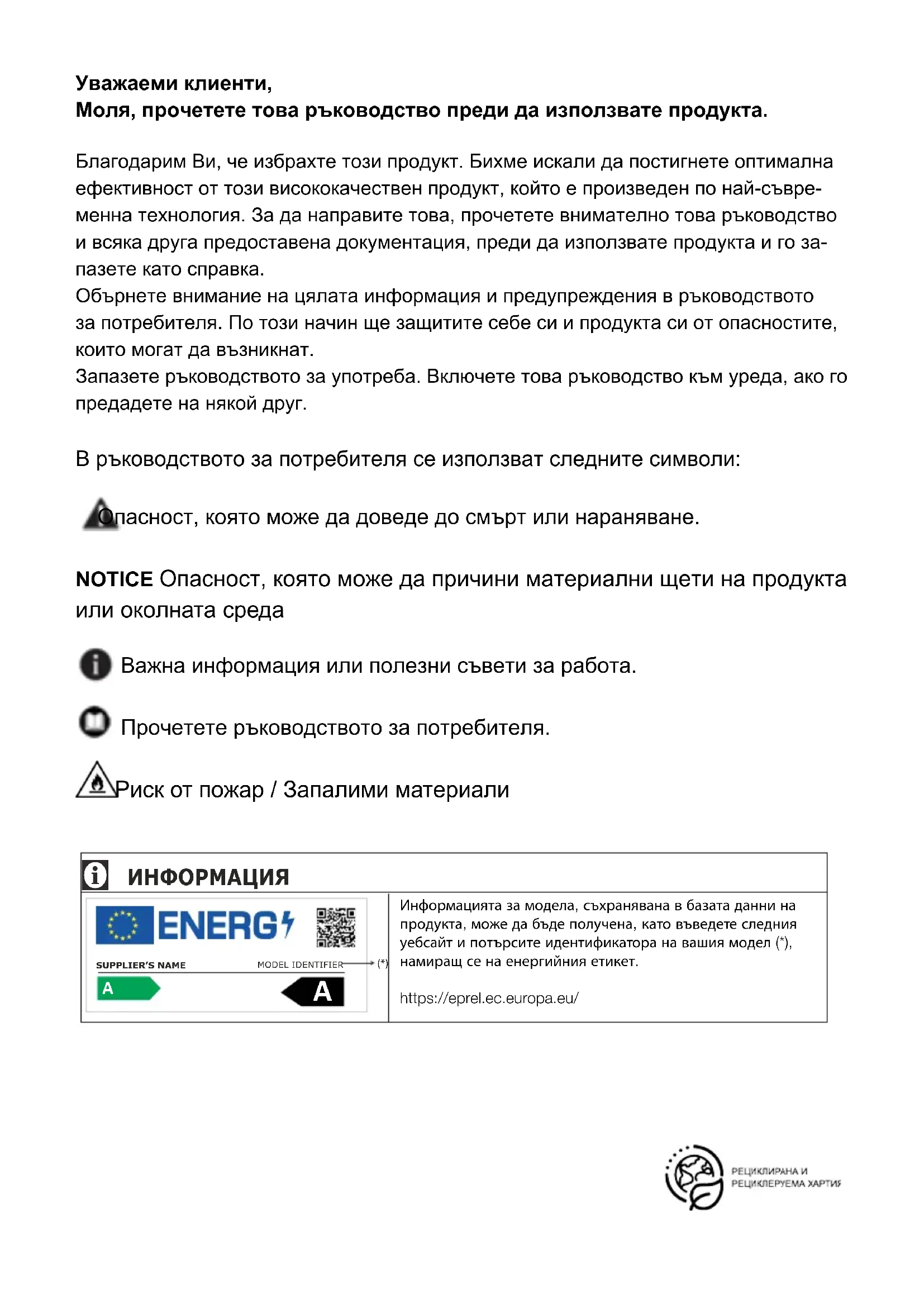 Информацията за модела, съхранявана в базата данни на продукта, може да бъде получена, като въведете следни я уебсайт и потърсите идентификатора на вашия модел (*), намиращ се на енергийния етикет. https://eprel.ec.europa.eu/ Уважаеми клиенти, Моля, прочетете това ръководство преди да използвате продукта. Благодарим Ви, че избрахте този продукт. Бихме искали да постигнете оптимална ефективност от този висококачествен продукт, който е произведен по най-съвре-менна технология. За да направите това, прочетете внимателно това ръководство и всяка друга предоставена документация, преди да използвате продукта и го за-пазете като справка. Обърнете внимание на цялата информация и предупреждения в ръководството за потребителя. По този начин ще защитите себе си и продукта си от опасностите, които могат да възникнат.Запазете ръководството за употреба. Включете това ръководство към уреда, ако го предадете на някой друг. В ръководството за потребителя се използват следните символи: Опасност, която може да доведе до смърт или нараняване. NOTICE Опасност, която може да причини материални щети на продукта или околната среда Важна информация или полезни съвети за работа. Прочетете ръководството за потребителя. Риск от пожар / Запалими материали2 / 33 BG Хладилник / Ръководство за експлоатация 1 Инструкции за безопасност 3