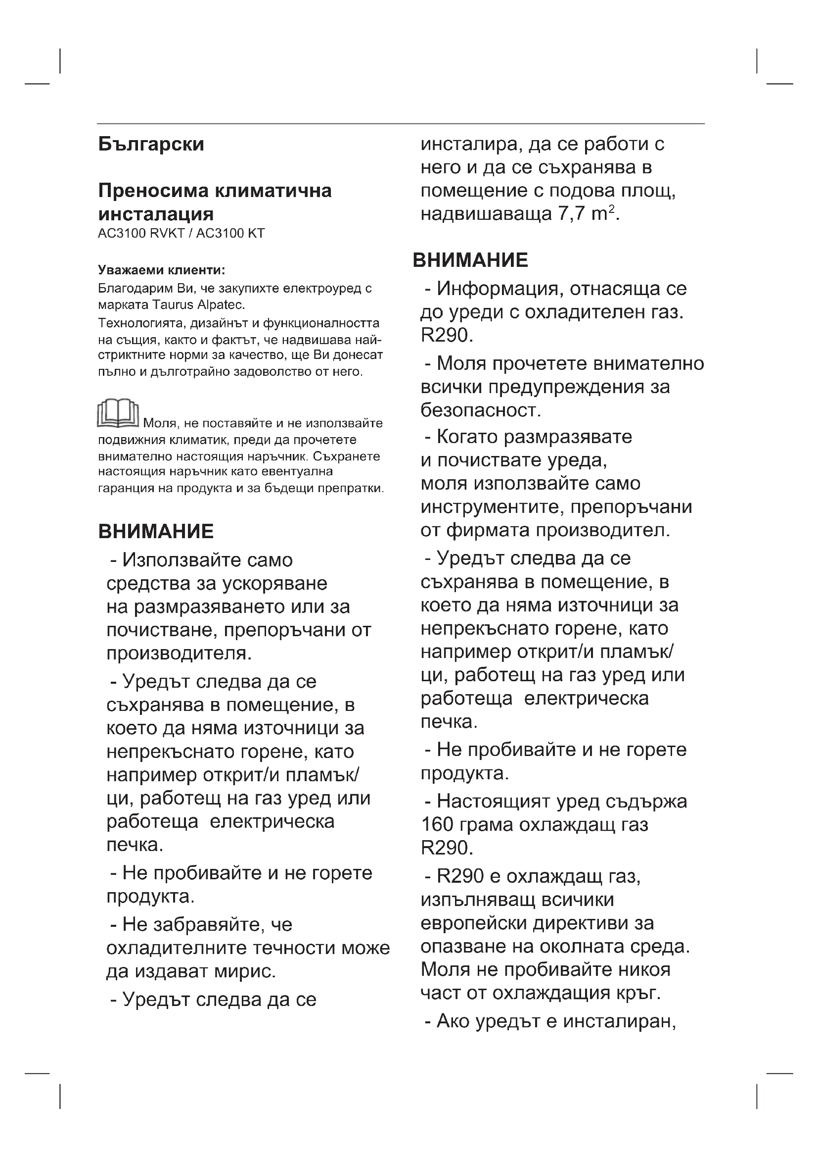 Уважаеми клиенти: Благодарим Ви, че закупихте електроуред с марката Taurus Alpatec. Технологията, дизайнът и функционалността на същия, както и фактът, че надвишава най- стриктните норми за качество, ще Ви донесат пълно и дълготрайно задоволство от него. Моля, не поставяйте и не използвайте подвижния климатик, преди да прочетете внимателно настоящия наръчник. Съхранете настоящия наръчник като евентуална гаранция на продукта и за бъдещи препратки.