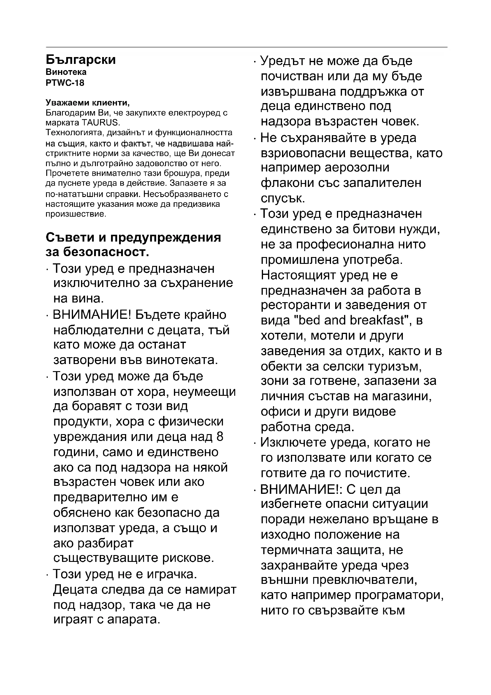 PTWC-18 Уважаеми клиенти, Благодарим Ви, че закупихте електроуред с марката TAURUS. Технологията, дизайнът и функционалността на същия, както и фактът, че надвишава най- стриктните норми за качество, ще Ви донесат пълно и дълготрайно задоволство от него. Прочетете внимателно тази брошура, преди да пуснете уреда в действие. Запазете я за по-нататъшни справки. Несъобразяването с настоящите указания може да предизвика произшествие. Съвети и предупреждения за безопасност. Този уред е предназначен изключително за съхранение