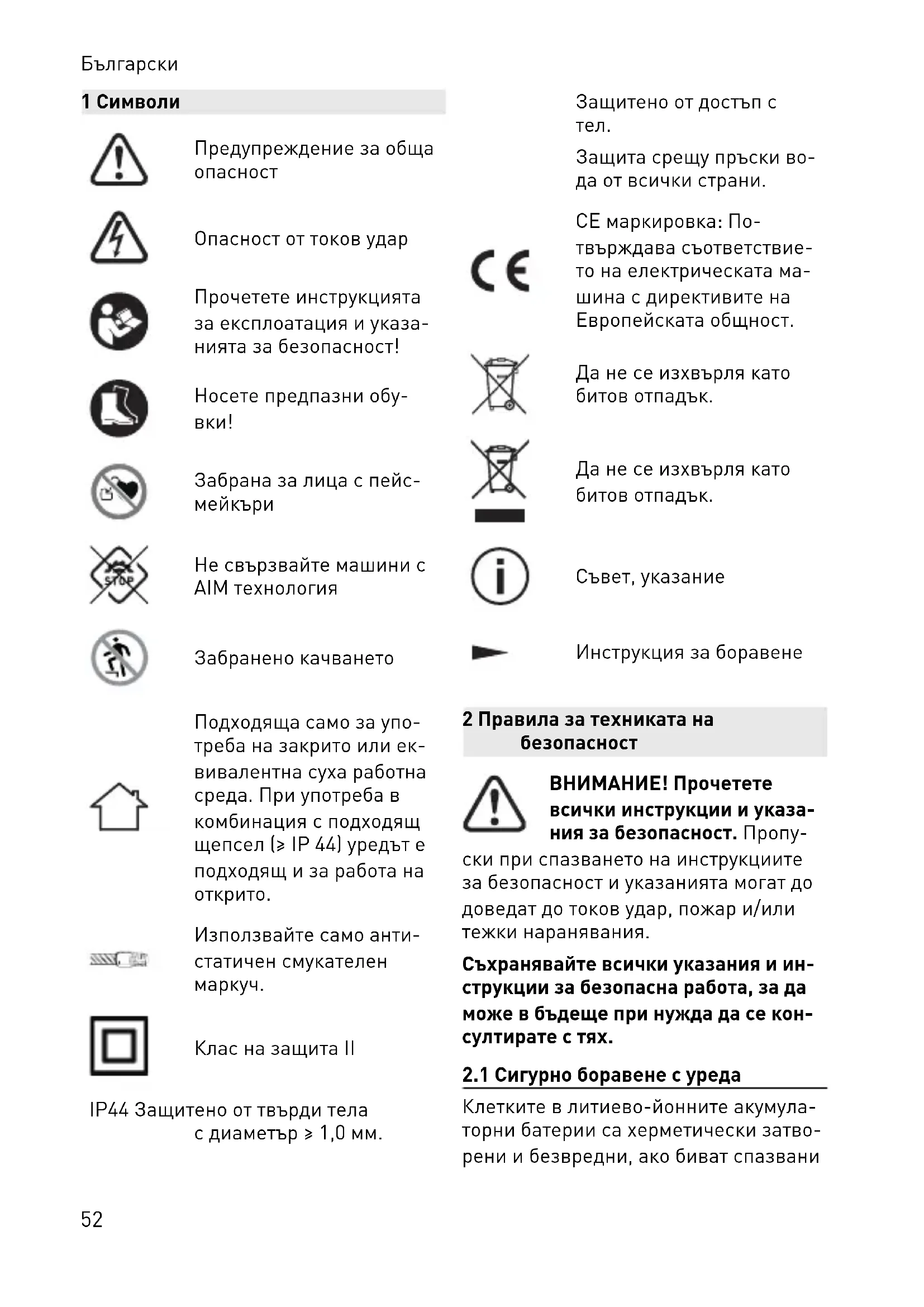 Защита срещу пръски во да от всички страни. CE маркировка: По твърждава съответствие то на електрическата ма шина с директивите на Европейската общност. Да не се изхвърля като битов отпадък. Да не се изхвърля като битов отпадък. Съвет, указание Инструкция за боравене 2 Правила за техниката на безопасност ВНИМАНИЕ! Прочетете всички инструкции и указа ния за безопасност. Пропу ски при спазването на инструкциите за безопасност и указанията могат до доведат до токов удар, пожар и/или тежки наранявания. Съхранявайте всички указания и ин струкции за безопасна работа, за да може в бъдеще при нужда да се кон султирате с тях.