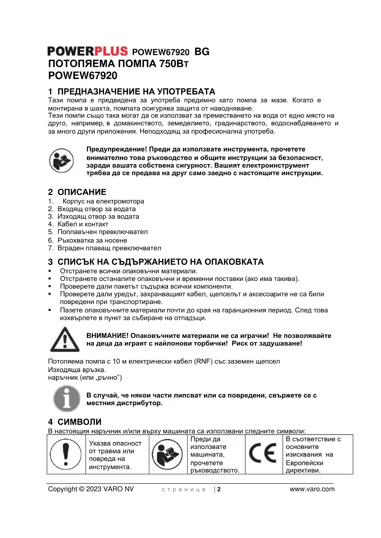 - 16 ДЕКЛАРАЦИЯ ЗА СЪОТВЕТСТВИЕ POWEW67920 BG Copyright © 2023 VARO NV с т р а н и ц а | 2 www.varo.com ПОТОПЯЕМА ПОМПА 750ВТ POWEW67920 1 ПРЕДНАЗНАЧЕНИЕ НА УПОТРЕБАТА Тази помпа е предвидена за употреба предимно като помпа за мазе. Когато е монтирана в шахта, помпата осигурява защита от наводняване. Тези помпи също така могат да се използват за преместването на вода от едно място на друго, например, в домакинството, земеделието, градинарството, водоснабдяването и за много други приложения. Неподходящ за професионална употреба. Предупреждение! Преди да използвате инструмента, прочетете внимателно това ръководство и общите инструкции за безопасност, заради вашата собствена сигурност. Вашият електроинструмент трябва да се предава на друг само заедно с настоящите инструкции. 2 ОПИСАНИЕ p. 8