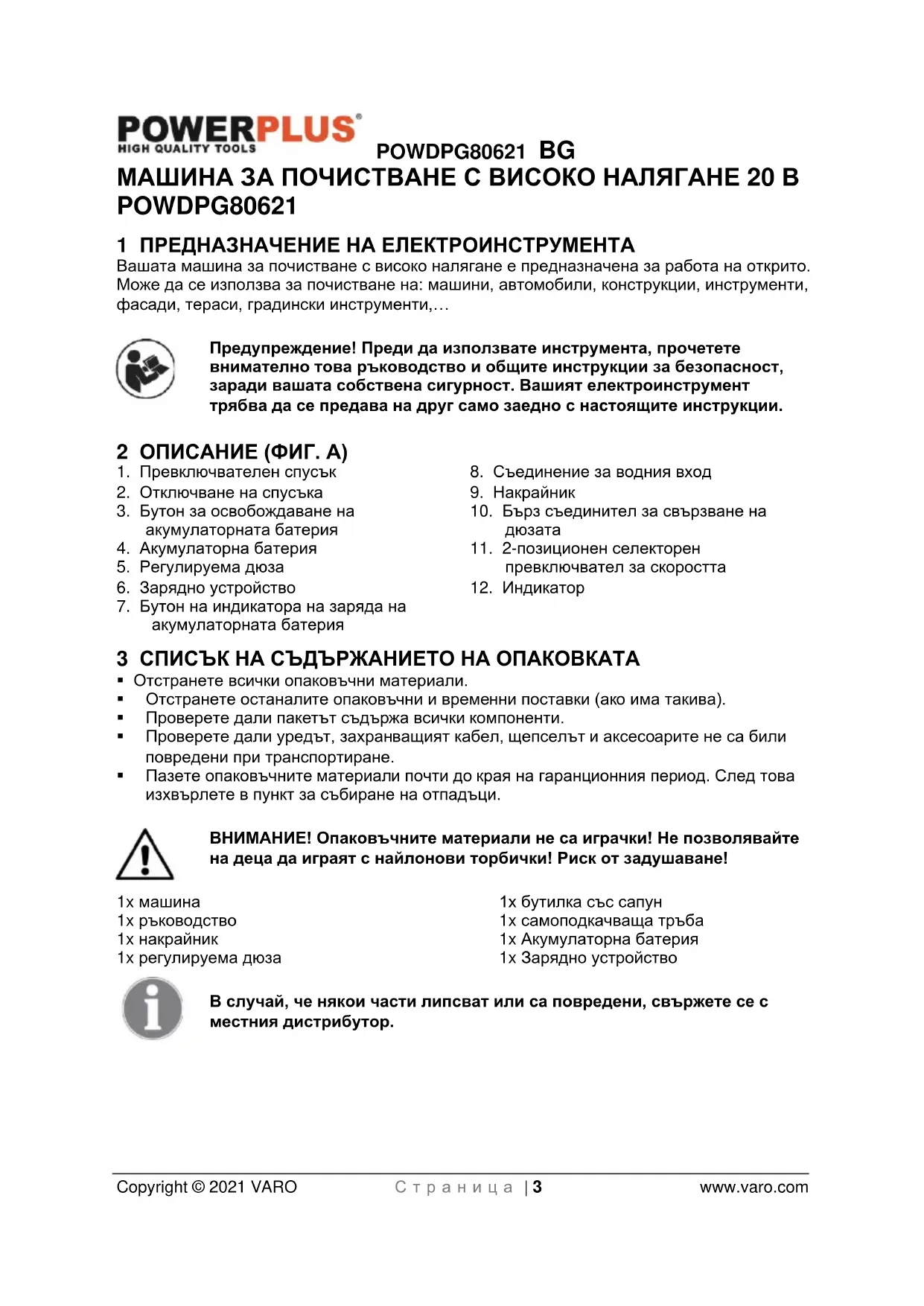 - Пазете опаковъчните материали почти до края на гаранционния период. След това изхвърлете в пункт за събиране на отпадъци. ВНИМАНИЕ! Опаковъчните материали не са играчки! Не позволявайте на деца да играят с найлонови торбички! Риск от задушаване! 1x машина 1x ръководство 1x накрайник 1x регулируема дюза 1x бутилка със сапун 1x самоподкачваща тръба 1x Акумулаторна батерия 1x Зарядно устройство В случай, че някои части липсват или са повредени, свържете се с местния дистрибутор.POWDPG80621 BG Copyright © 2021 VARO С т р а н и ц а | 4 www.varo.com 4 СИМВОЛИ В настоящия наръчник и/или върху машината са използвани следните символи: