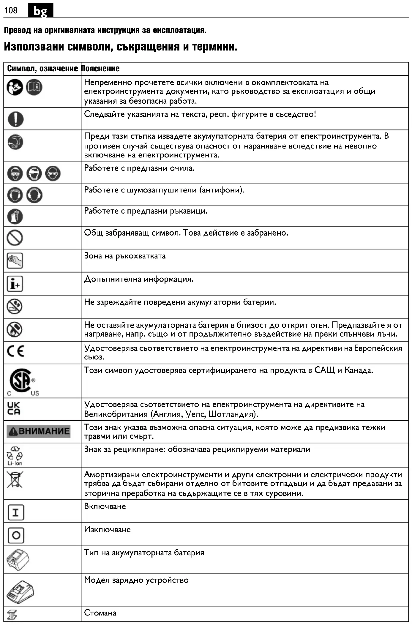 Превод на оригиналната инструкция за експлоатация. Използвани символи, съкращения и термини. Символ, означение Пояснение Непременно прочетете всички включени в окомплектовката на електроинструмента документи, като ръководство за експлоатация и общи указания за безопасна работа. Следвайте указанията на текста, респ. фигурите в съседство! Преди тази стъпка извадете акумулаторната батерия от електроинструмента. В противен случай съществува опасност от нараняване вследствие на неволно включване на електроинструмента. Работете с предпазни очила. Работете с шумозаглушители (антифони). Работете с предпазни ръкавици. Общ забраняващ символ. Това действие е забранено. Зона на ръкохватката Допълнителна информация. Не зареждайте повредени акумулаторни батерии. Не оставяйте акумулаторната батерия в близост до открит огън. Предпазвайте я от нагряване, напр. също и от продължително въздействие на преки слънчеви лъчи. Удостоверява съответствието на електроинструмента на директиви на Европейския