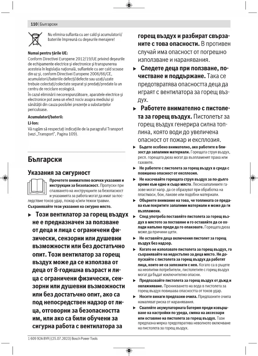 Пистолетът за горещ въздух, акумулаторната батерия, принадлежностите и опаковките трябва да се предават за оползотворяване на съдържащите се в тях суровини. Не изхвърляйте пистолета за горещ въздух и акумулаторните батерии/батериите при би- товите отпадъци! Само за страни отЕС: Съгласно европейска директива 2012/19/EС за старите електрически и електронни уреди и нейното транспорти- ране в националното право пистолети за горещ въздух, които не могат да се ползват повече, а съгласно евро- пейска директива 2006/66/EО повредени или изхабени обикновени или акумулаторни батерии, трябва да се съ- бират и предават за оползотворяване на съдържащите се в тях суровини. При неправилно изхвърляне старите електрически и електронни уреди поради възможното наличие на опасни вещества могат да окажат вредни влияния върху околна- та среда и човешкото здраве. Акумулаторни или обикновени батерии: Литиево-йонни: Моля, спазвайте указанията в раздела Транспортиране (вж. „Транспортиране“, Страница114).