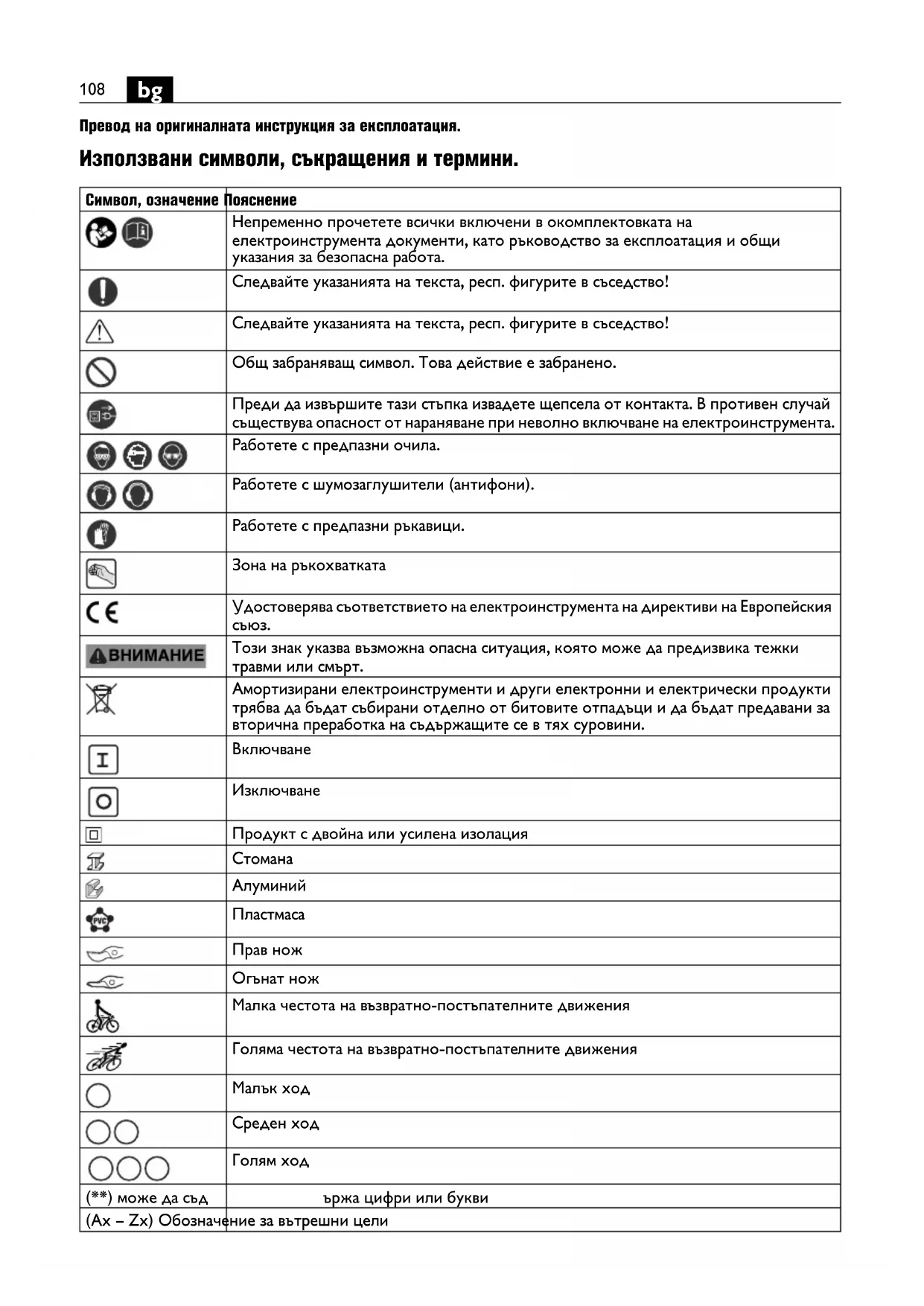 Превод на оригиналната инструкция за експлоатация. Използвани символи, съкращения и термини. Символ, означение Пояснение Непременно прочетете всички включени в окомплектовката на електроинструмента документи, като ръководство за експлоатация и общи указания за безопасна работа. Следвайте указанията на текста, респ. фигурите в съседство! Следвайте указанията на текста, респ. фигурите в съседство! Общ забраняващ символ. Това действие е забранено. Преди да извършите тази стъпка извадете щепсела от контакта. В противен случай съществува опасност от нараняване при неволно включване на електроинструмента. Работете с предпазни очила. Работете с шумозаглушители (антифони). Работете с предпазни ръкавици. Зона на ръкохватката Удостоверява съответствието на електроинструмента на директиви на Европейския