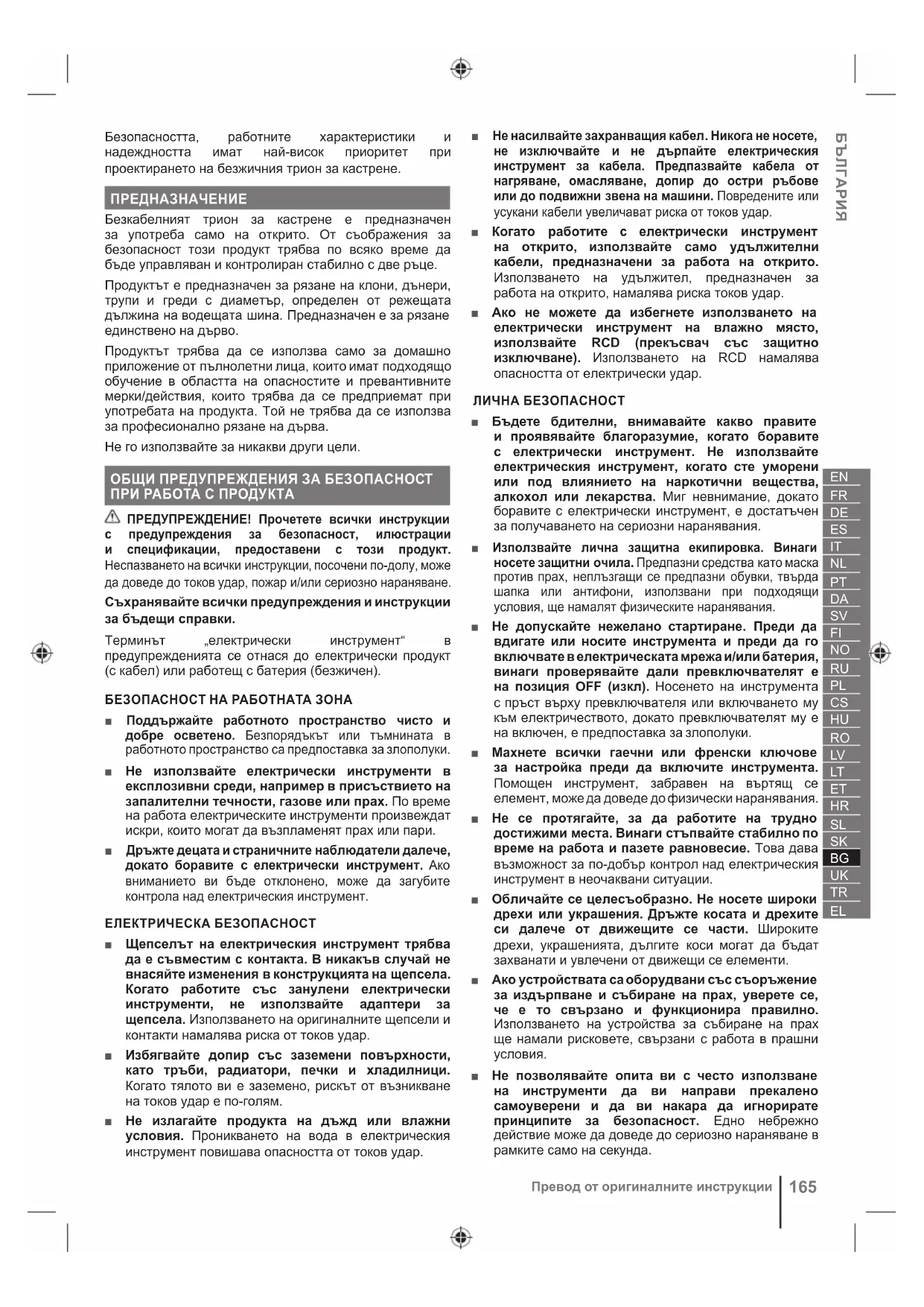 Безопасността, работните характеристики и надеждността имат най-висок приоритет при проектирането на безжичния трион за кастрене. ПРЕДНАЗНАЧЕНИЕ Безкабелният трион за кастрене е предназначен за употреба само на открито. От съображения за безопасност този продукт трябва по всяко време да бъде управляван и контролиран стабилно с две ръце. Продуктът е предназначен за рязане на клони, дънери, трупи и греди с диаметър, определен от режещата дължина на водещата шина. Предназначен е за рязане единствено на дърво. Продуктът трябва да се използва само за домашно приложение от пълнолетни лица, които имат подходящо обучение в областта на опасностите и превантивните мерки/действия, които трябва да се предприемат при употребата на продукта. Той не трябва да се използва за професионално рязане на дърва. Не го използвайте за никакви други цели. ОБЩИ ПРЕДУПРЕЖДЕНИЯ ЗА БЕЗОПАСНОСТ ПРИ РАБОТА С ПРОДУКТА ПРЕДУПРЕЖДЕНИЕ! Прочетете всички инструкции с предупреждения за безопасност, илюстрации и спецификации, предоставени с този продукт. Неспазването на всички инструкции, посочени по-долу, може да доведе до токов удар, пожар и/или сериозно нараняване. Съхранявайте всички предупреждения и инструкции за бъдещи справки. Терминът „електрически инструмент“ в предупрежденията се отнася до електрически продукт (с кабел) или работещ с батерия (безжичен). БЕЗОПАСНОСТ НА РАБОТНАТА ЗОНА ■ Поддържайте работното пространство чисто и добре осветено. Безпорядъкът или тъмнината в работното пространство са предпоставка за злополуки. ■ Не използвайте електрически инструменти в експлозивни среди, например в присъствието на запалителни течности, газове или прах. По време на работа електрическите инструменти произвеждат искри, които могат да възпламенят прах или пари. ■ Дръжте децата и страничните наблюдатели далече, докато боравите с електрически инструмент. Ако вниманието ви бъде отклонено, може да загубите контрола над електрическия инструмент. ЕЛЕКТРИЧЕСКА БЕЗОПАСНОСТ ■ Щепселът на електрическия инструмент трябва да е съвместим с контакта. В никакъв случай не внасяйте изменения в конструкцията на щепсела. Когато работите със занулени електрически инструменти, не използвайте адаптери за щепсела. Използването на оригиналните щепсели и контакти намалява риска от токов удар. ■ Избягвайте допир със заземени повърхности, като тръби, радиатори, печки и хладилници. Когато тялото ви е заземено, рискът от възникване на токов удар е по-голям. ■ Не излагайте продукта на дъжд или влажни условия. Проникването на вода в електрическия инструмент повишава опасността от токов удар. ■ Не насилвайте захранващия кабел. Никога не носете, не изключвайте и не дърпайте електрическия инструмент за кабела. Предпазвайте кабела от нагряване, омасляване, допир до остри ръбове или до подвижни звена на машини. Повредените или усукани кабели увеличават риска от токов удар. ■ Когато работите с електрически инструмент на открито, използвайте само удължителни кабели, предназначени за работа на открито. Използването на удължител, предназначен за работа на открито, намалява риска токов удар. ■ Ако не можете да избегнете използването на електрически инструмент на влажно място, използвайте RCD (прекъсвач със защитно изключване). Използването на RCD намалява опасността от електр