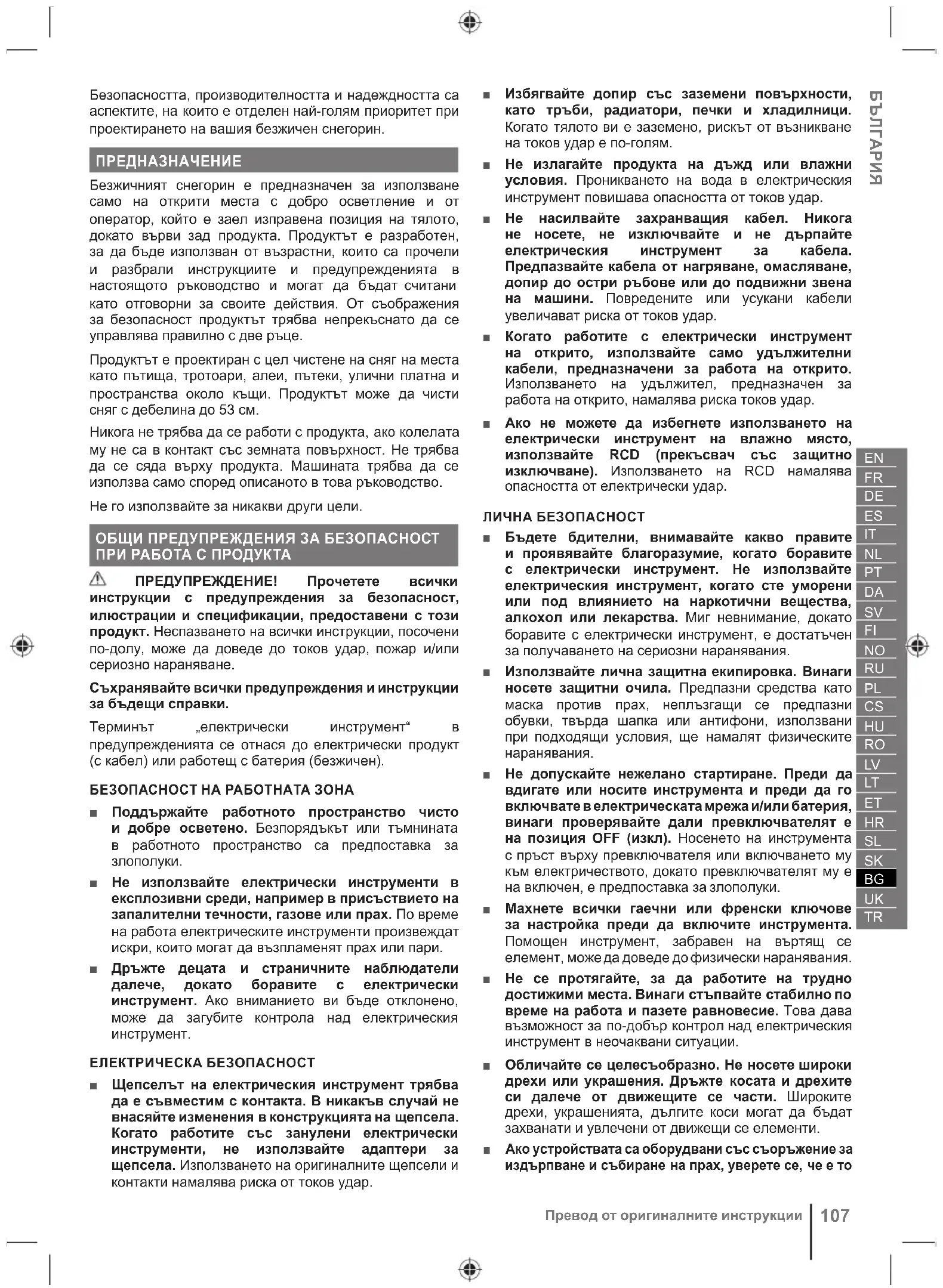 ■ Ако продуктът падне, претърпи силен удар или започне да вибрира необичайно, незабавно го изключете и проверете за повреди или установете причината за вибрациите. Поправките и замените на части при повреда трябва да се извършват от оторизиран сервизен център.110 Превод от оригиналните инструкции ■ С продукта трябва да се работи само при температури между 0°C и 40°C. ■ Съхранявайте продукта при околна температура между 0°C и 40°C. ДОПЪЛНИТЕЛНИ ПРЕДУПРЕЖДЕНИЯ ЗА БЕЗОПАСНОСТ ЗА БАТЕРИЯТА ■ За да намалите риска от пожар, физическо нараняване и повреда на продукта поради късо съединение, никога не потапяйте продукта, комплекта батерии или зарядното устройство в течност и не позволявайте в тях да проникне течност. Течностите, предизвикващи корозия или провеждащи електричество, като солена вода, определени химикали, избелващи вещества или продукти, съдържащи избелващи вещества, могат да предизвикат късо съединение. ■ Зареждайте акумулаторната батерия на място, на което околната температура е между 10°C и 38°C. ■ Съхранявайте акумулаторната батерия на място, на което околната температура е между 0°C и 20°C. ■ Използвайте акумулаторната батерия на място, на което околната температура е между 0°C и 40°C. СЪВЕТИ ЗА РАБОТА С ПРОДУКТА ■ Продуктът няма да работи, ако горната ръкохватка не е поставена правилно и фиксиращата скоба на ръкохватката не е здраво захваната. Има 2 предпазни блокировки, които помагат за предотвратяване на случайно стартиране, когато продуктът не е правилно сглобен. ■ Обърнете внимание на посоката на вятъра, преди да започнете работа с машината. Изхвърляйте снега по посока на вятъра, за да предотвратите връщане на сняг към оператора. ИЗЧИСТВАНЕ НА ЗАПУШВАНЕ Никога не поставяйте ръцете или краката си пред продукта или пред улея за изхвърляне, за да избегнете сериозни наранявания. Не почиствайте отвора за изхвърляне с ръце.