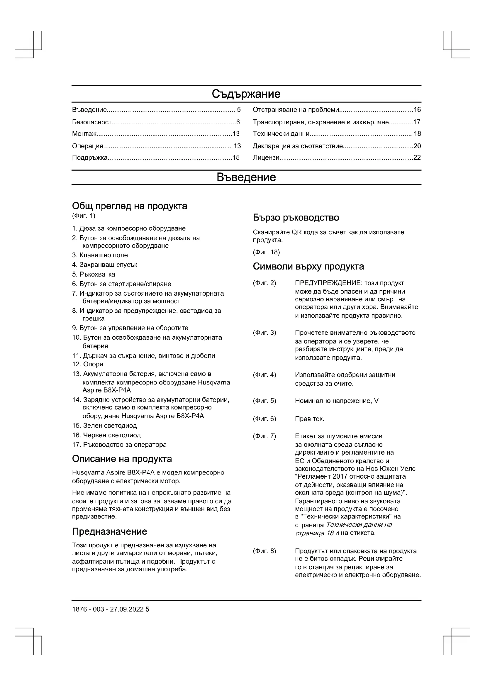 Huskvarna, 2022-06-30 Claes Losdal, Мениджър по развойна дейност, Husqvarna AB Отговорен за техническата документация 20 1876 - 003 - 27.09.2022Декларация за съответствие на Обединеното кралство Ние, Husqvarna AB, SE-561 82 Huskvarna, ШВЕЦИЯ, тел.: +46-36-146500, декларираме на своя собствена отговорност, че продуктът: Описание Ръчно компресорно оборудване с акумулаторна батерия Марка Husqvarna Тип/модел Aspire B8X-P4A Идентификация Серийни номера от 2022 г. и след това отговаря напълно на следните разпоредби на Обединеното кралство: