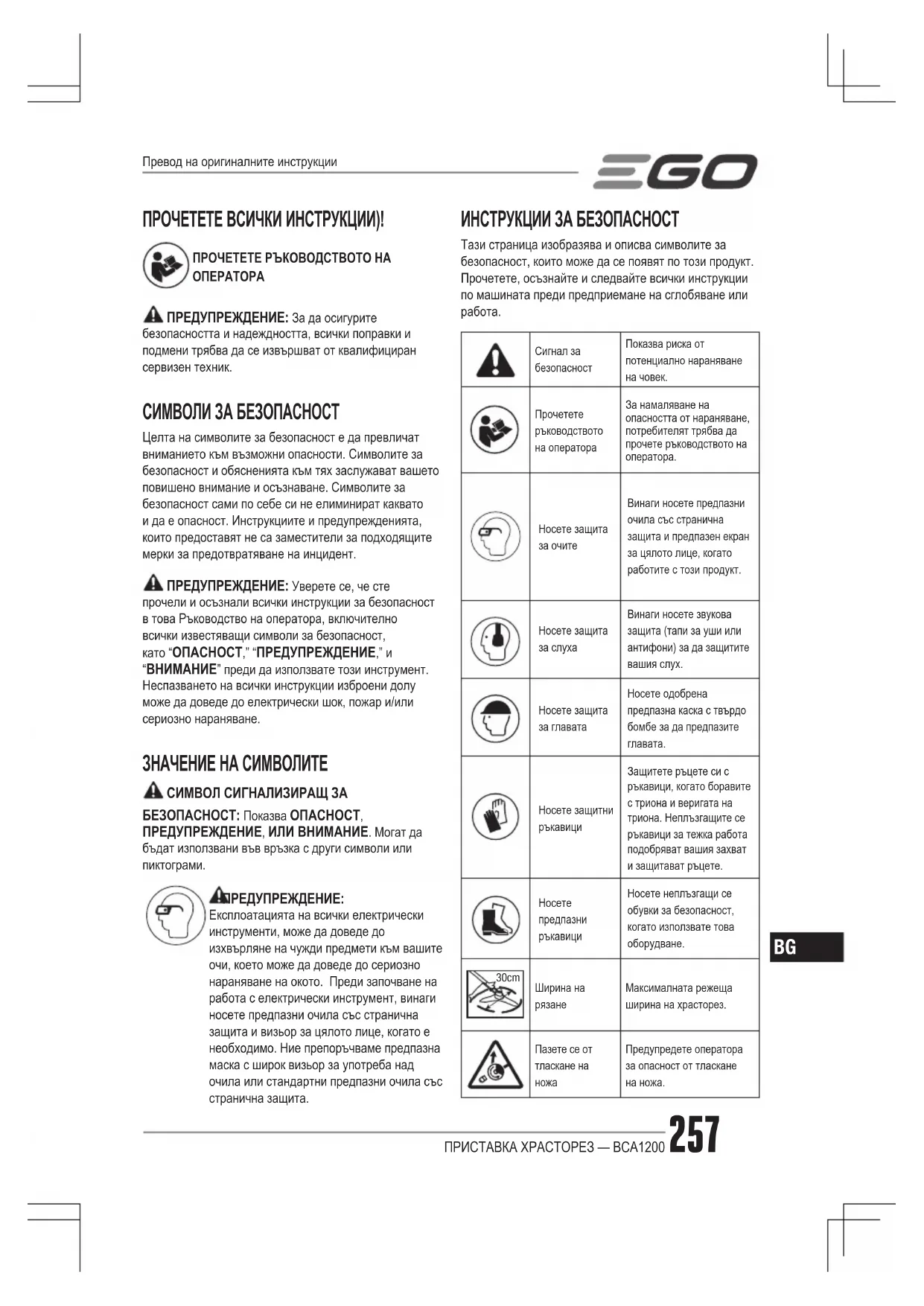 Сигнал за безопасностПоказва риска от потенциално нараняване на човек.Прочетете ръководството на оператораЗа намаляване на опасността от нараняване, потребителят трябва да прочете ръководството на оператора.Носете защита за очитеВинаги носете предпазни очила със странична защита и предпазен екран за цялото лице, когато работите с този продукт.Носете защита за слухаВинаги носете звукова защита (тапи за уши или антифони) за да защитите вашия слух.Носете защита за главатаНосете одобрена предпазна каска с твърдо бомбе за да предпазите главата.Носете защитни ръкавициЗащитете ръцете си с ръкавици, когато боравите с триона и веригата на триона. Неплъзгащите се ръкавици за тежка работа подобряват вашия захват и защитават ръцете.Носете предпазни ръкавициНосете неплъзгащи се обувки за безопасност, когато използвате това оборудване. 30cm Ширина на рязанеМаксималната режеща ширина на храсторез.Пазете се от тласкане на Предупредете оператора за опасност от тласкане на ножа. Превод на оригиналните инструкцииПРИСТАВКА ХРАСТОРЕЗ — BCA1200258