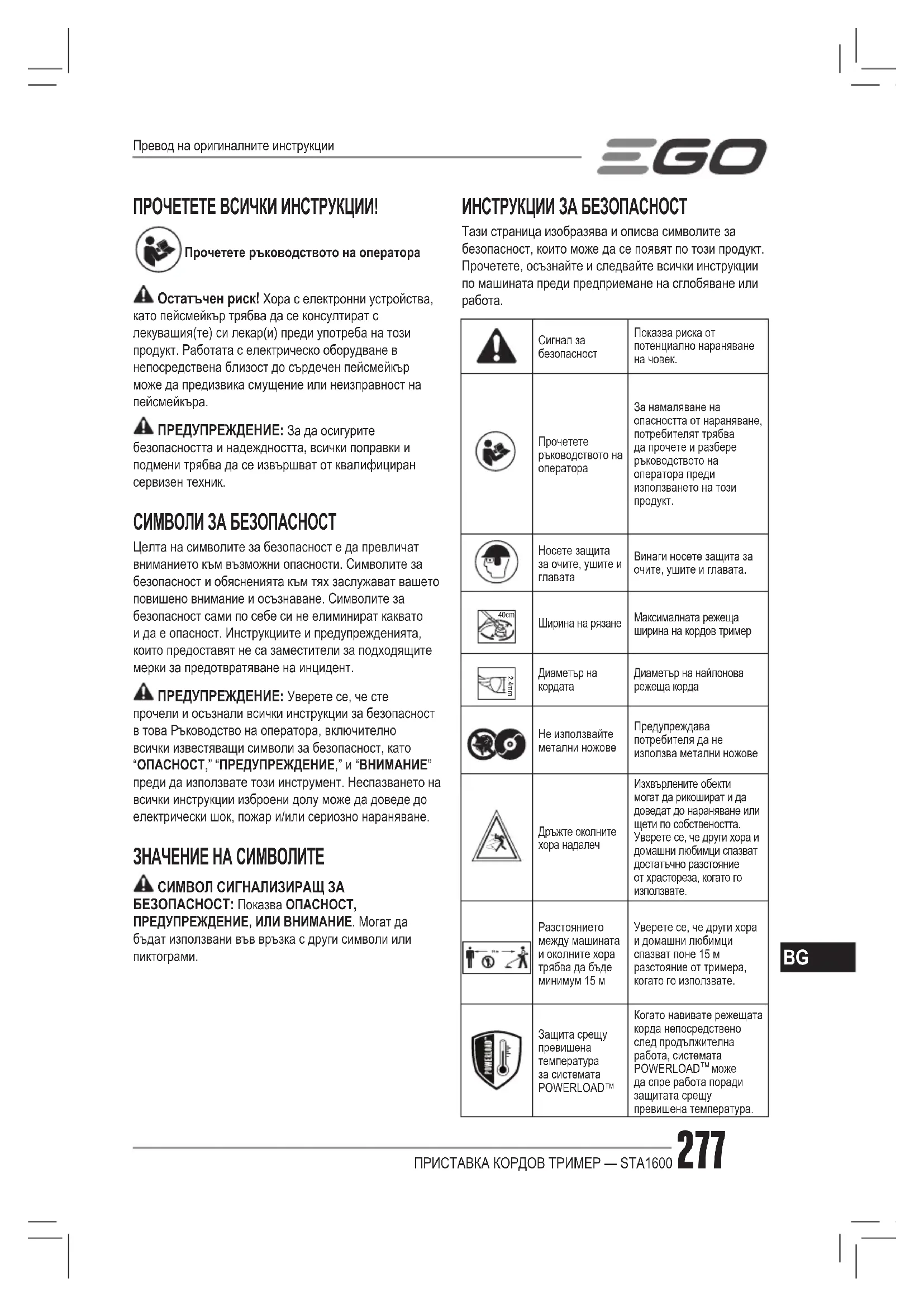 Сигнал за безопасностПоказва риска от потенциално нараняване на човек.Прочетете ръководството на оператораЗа намаляване на опасността от нараняване, потребителят трябва да прочете и разбере ръководството на оператора преди използването на този продукт.Носете защита за очите, ушите и главатаВинаги носете защита за очите, ушите и главата. 40cm Ширина на рязанеМаксималната режеща ширина на кордов тример 2.4mmДиаметър на кордатаДиаметър на найлонова режеща кордаНе използвайте метални ножовеПредупреждава потребителя да не използва метални ножове Дръжте околните хора надалечИзхвърлените обекти могат да рикошират и да доведат до нараняване или щети по собствеността. Уверете се, че други хора и домашни любимци спазват достатъчно разстояние от храстореза, когато го използвате.Разстоянието между машината и околните хора трябва да бъде минимум 15 мУверете се, че други хора и домашни любимци спазват поне 15 м разстояние от тримера, когато го използвате.Защита срещу превишена температура за системата POWERLOAD Когато навивате режещата корда непосредствено след продължителна работа, системата POWERLOAD може да спре работа поради защитата срещу превишена температура. Превод на оригиналните инструкцииПРИСТАВКА КОРДОВ ТРИМЕР — STA1600278