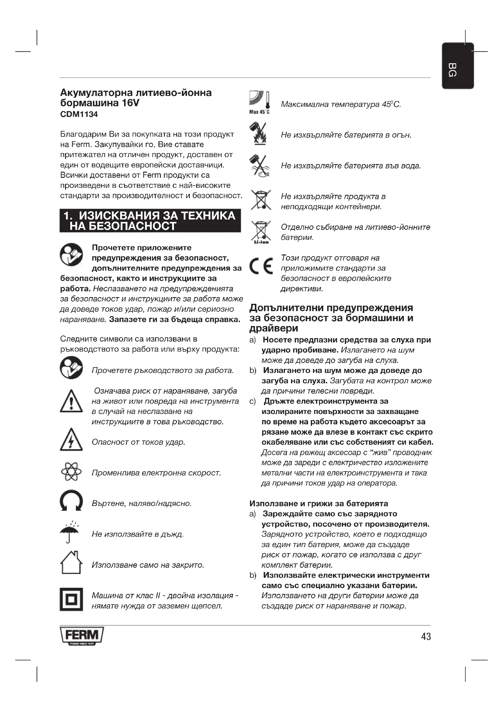 Акумулаторна литиево-йонна бормашина 16V CDM1134 Благодарим Ви за покупката на този продукт на Ferm. Закупувайки го, Вие ставате притежател на отличен продукт, доставен от един от водещите европейски доставчици. Всички доставени от Ferm продукти са произведени в съответствие с най-високите стандарти за производителност и безопасност.