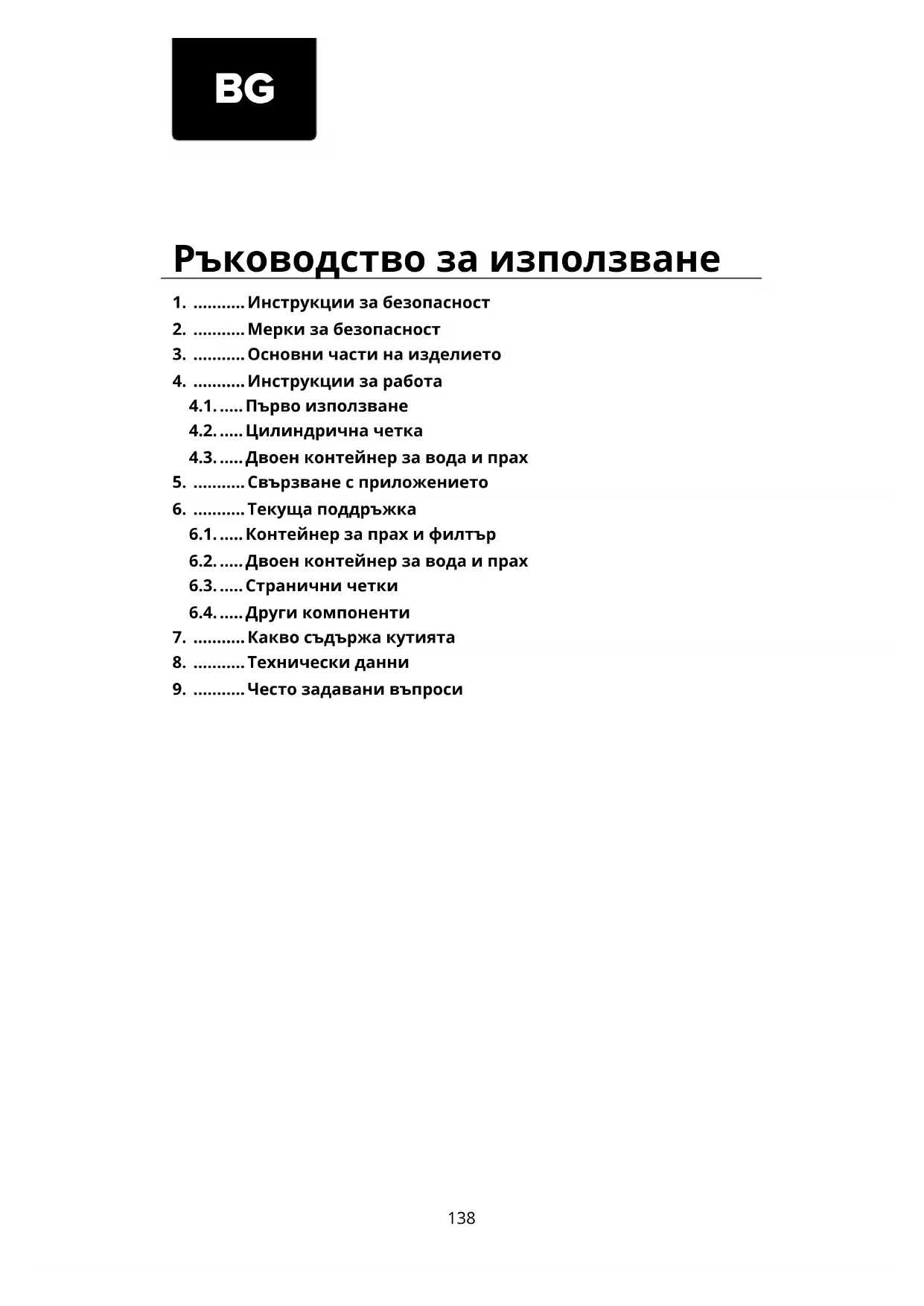 6.1. ..... Контейнер за прах и филтър 6.2. ..... Двоен контейнер за вода и прах 6.3. ..... Странични четки 6.4. ..... Други компоненти