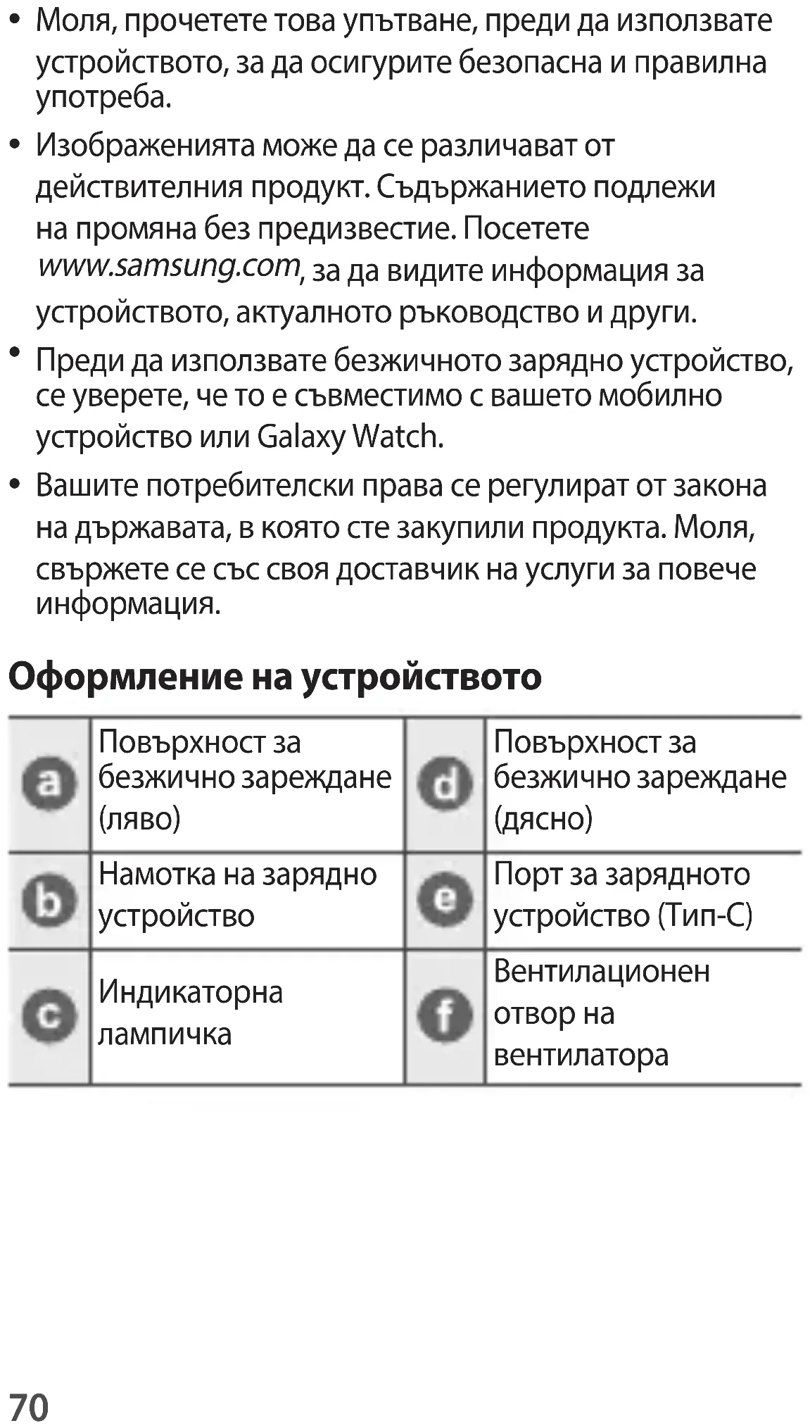 Когато зареждате две мобилни устройства (освен Galaxy Watch) едновременно, не можете да използвате бързо безжично зареждане 2.0. (Бързо безжично зареждане 2.0: 10 W или повече на безжично зареждане с оригинално сертифицирано зарядно устройство Samsung)76 Информация за безопасност Прочетете цялата информация за безопасност, преди да използвате устройството, за да осигурите безопасна и правилна употреба. За да видите пълната информация за безопасност, идете до уебсайта на Samsung. Използвайте батерии, зарядни устройства, аксесоари и резервни части, одобрени от производителя Не докосвайте устройството с мокри ръце Не изпускайте или подлагайте зарядното устройство на удар Устройството може да се използва на места с температура на околна среда между 0°C до 35°C. Можете да съхранявате устройството при температура на околната среда между -20°C до 50°C. Използването или съхраняването на устройството извън препоръчаните температурни диапазони може да повреди устройството или да намали живота на батерията Предотвратете контакта на многофункционалния жак, малкия край на зарядното устройство и вентилационния отвор на вентилатора с проводими материали като течности, прах, метален прах и графит на моливи Не покривайте или блокирайте вентилационния отвор на вентилатора Не позволявайте на деца или животни да дъвчат или смучат устройството Не разглобявайте, не модифицирайте и не ремонтирайте сами устройството си77