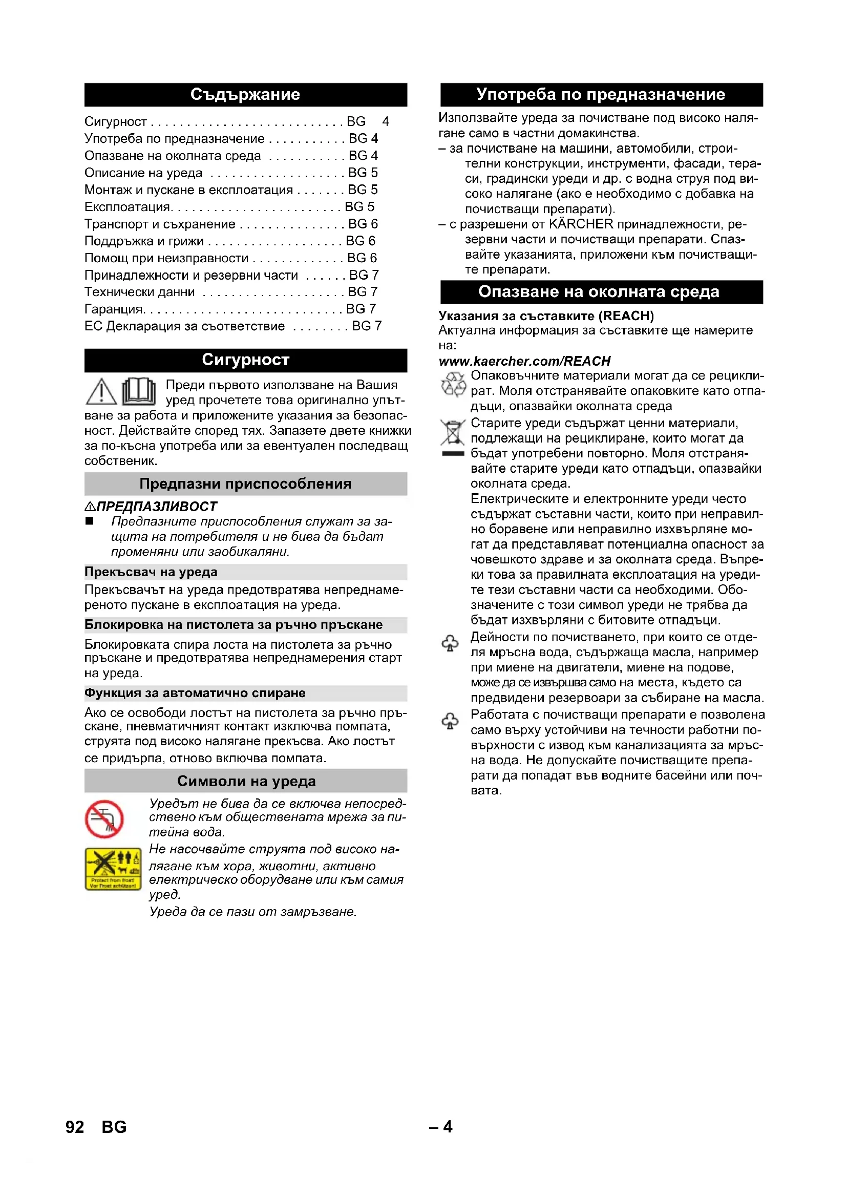 Ако се освободи лостът на пистолета за ръчно пръ- скане, пневматичният контакт изключва помпата, струята под високо налягане прекъсва. Ако лостът се придърпа, отново включва помпата. Използвайте уреда за почистване под високо наля- гане само в частни домакинства. – за почистване на машини, автомобили, строи- телни конструкции, инструменти, фасади, тера- си, градински уреди и др. с водна струя под ви- соко налягане (ако е необходимо с добавка на почистващи препарати). – с разрешени от KÄRCHER принадлежности, ре- зервни части и почистващи препарати. Спаз- вайте указанията, приложени към почистващи- те препарати. Указания за съставките (REACH) Актуална информация за съставките ще намерите