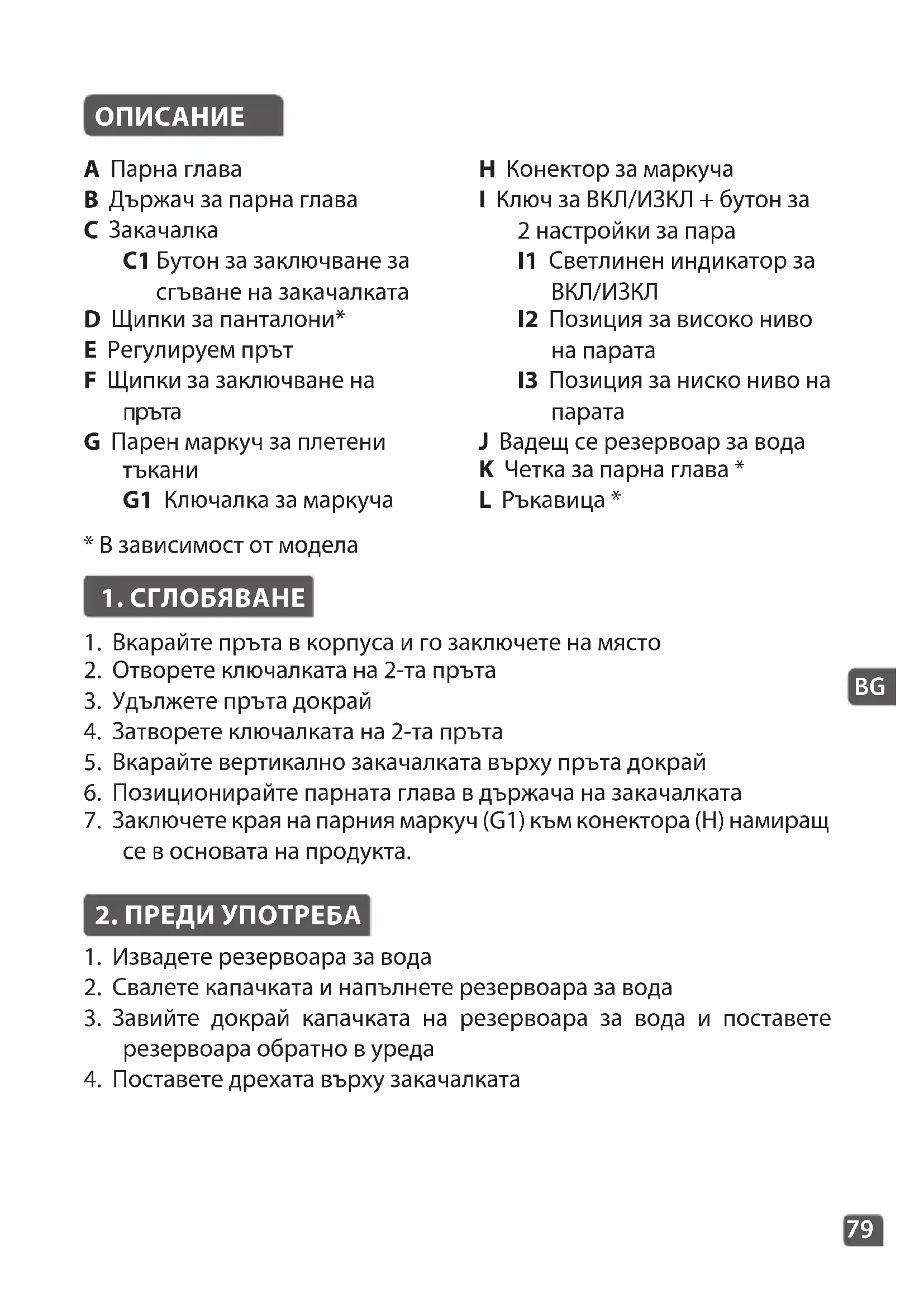 J Вадещ се резервоар за вода K Четка за парна глава * L Ръкавица *
