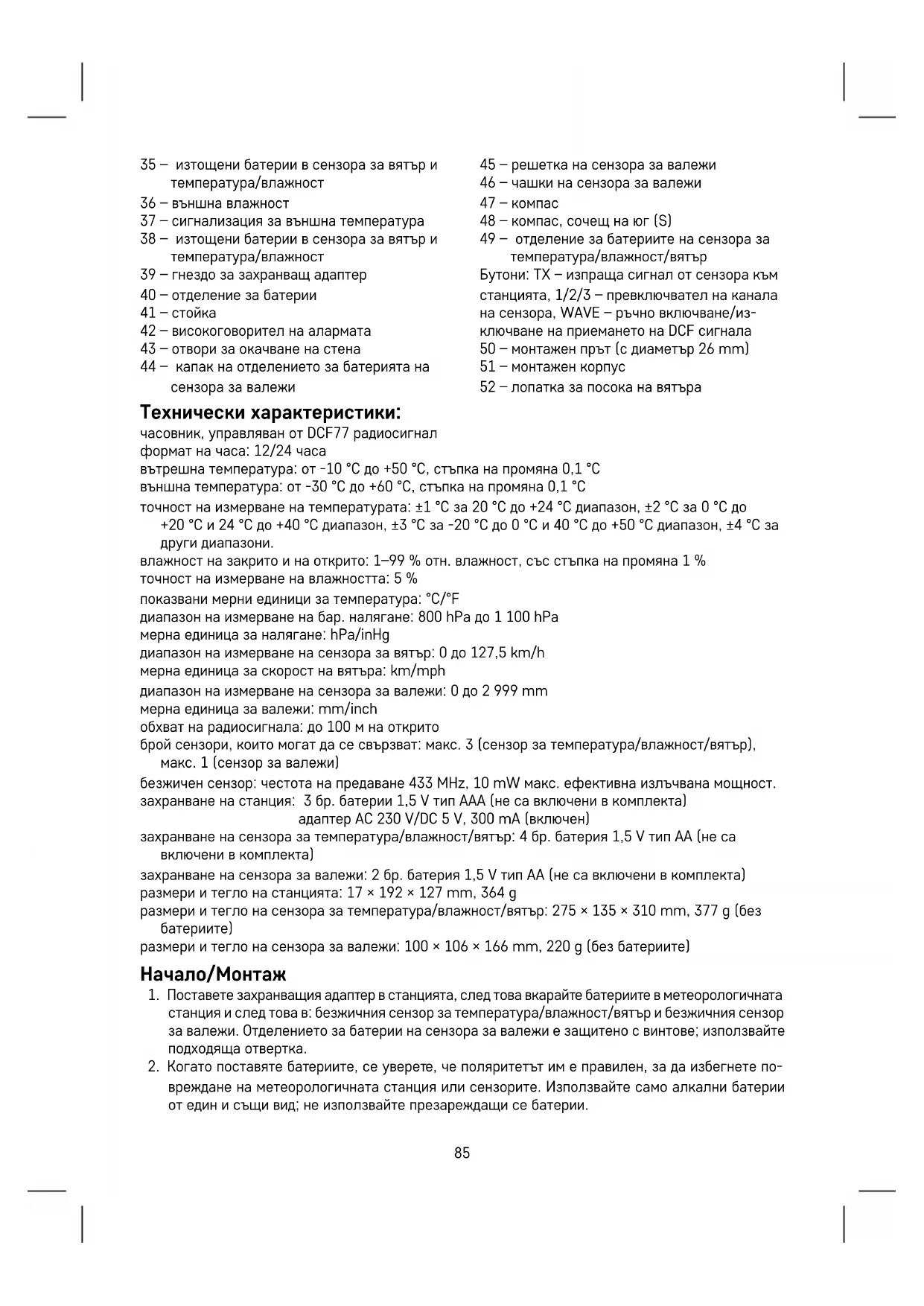 24 – индикатор за посока на вятъра 25 – бутон КАНАЛ – търсене на сигнал на сензор/превключване през информаци- ята от свързаните сензори 26 – посока на вятъра: S – юг, W – запад, N – север, E – изток 27 – бутон АЛАРМА – включване/изключване на алармата 28 – бутон НАСТРОЙКА – °C/°F мерни еди- ници за настройване на температурата, настройки на функциите 29 – бутон РЕЖИМ – превключване на режи- ма на дисплея 30 – данни от сензора за валежи 31 – сигнал от сензора за валежи 32 – изтощени батерии в сензора за валежи 33 – скорост на вятъра 34 – сигнал от сензора за вятър и температу- ра/влажност85 35 – изтощени батерии в сензора за вятър и температура/влажност 36 – външна влажност 37 – сигнализация за външна температура 38 – изтощени батерии в сензора за вятър и температура/влажност 39 – гнездо за захранващ адаптер 40 – отделение за батерии 41 – стойка 42 – високоговорител на алармата 43 – отвори за окачване на стена 44 – капак на отделението за батерията на сензора за валежи 45 – решетка на сензора за валежи 46 – чашки на сензора за валежи 47 – компас 48 – компас, сочещ на юг (S) 49 – отделение за батериите на сензора за температура/влажност/вятър Бутони: TX – изпраща сигнал от сензора към станцията, 1/2/3 – превключвател на канала на сензора, WAVE – ръчно включване/из- ключване на приемането на DCF сигнала 50 – монтажен прът (с диаметър 26 mm) 51 – монтажен корпус 52 – лопатка за посока на вятъра Технически характеристики: часовник, управляван от DCF77 радиосигнал формат на часа: 12/24 часа вътрешна температура: от -10°C до +50°C, стъпка на промяна 0,1°C външна температура: от -30°C до +60°C, стъпка на промяна 0,1°C точност на измерване на температурата: ±1°C за 20°C до +24°C диапазон, ±2°C за 0°C до +20°C и 24°C до +40°C диапазон, ±3°C за -20°C до 0°C и 40°C до +50°C диапазон, ±4°C за други диапазони. влажност на закрито и на открито: 1–99 % отн. влажност, със стъпка на промяна 1 % точност на измерване на влажността: 5 % показвани мерни единици за температура: °C/°F диапазон на измерване на бар. налягане: 800 hPa до 1 100 hPa мерна единица за налягане: hPa/inHg диапазон на измерване на сензора за вятър: 0 до 127,5 km/h мерна единица за скорост на вятъра: km/mph диапазон на измерване на сензора за валежи: 0 до 2 999 mm мерна единица за валежи: mm/inch обхват на радиосигнала: до 100 м на открито брой сензори, които могат да се свързват: макс. 3 (сензор за температура/влажност/вятър), макс. 1 (сензор за валежи) безжичен сензор: честота на предаване 433 MHz, 10 mW макс. ефективна излъчвана мощност. захранване на станция: 3 бр. батерии 1,5 V тип AAA (не са включени в комплекта) адаптер AC 230 V/DC 5 V, 300 mA (включен) захранване на сензора за температура/влажност/вятър: 4 бр. батерия 1,5 V тип AA (не са включени в комплекта) захранване на сензора за валежи: 2 бр. батерия 1,5 V тип AA (не са включени в комплекта) размери и тегло на станцията: 17 × 192 × 127 mm, 364 g размери и тегло на сензора за температура/влажност/вятър: 275 × 135 × 310 mm, 377 g (без