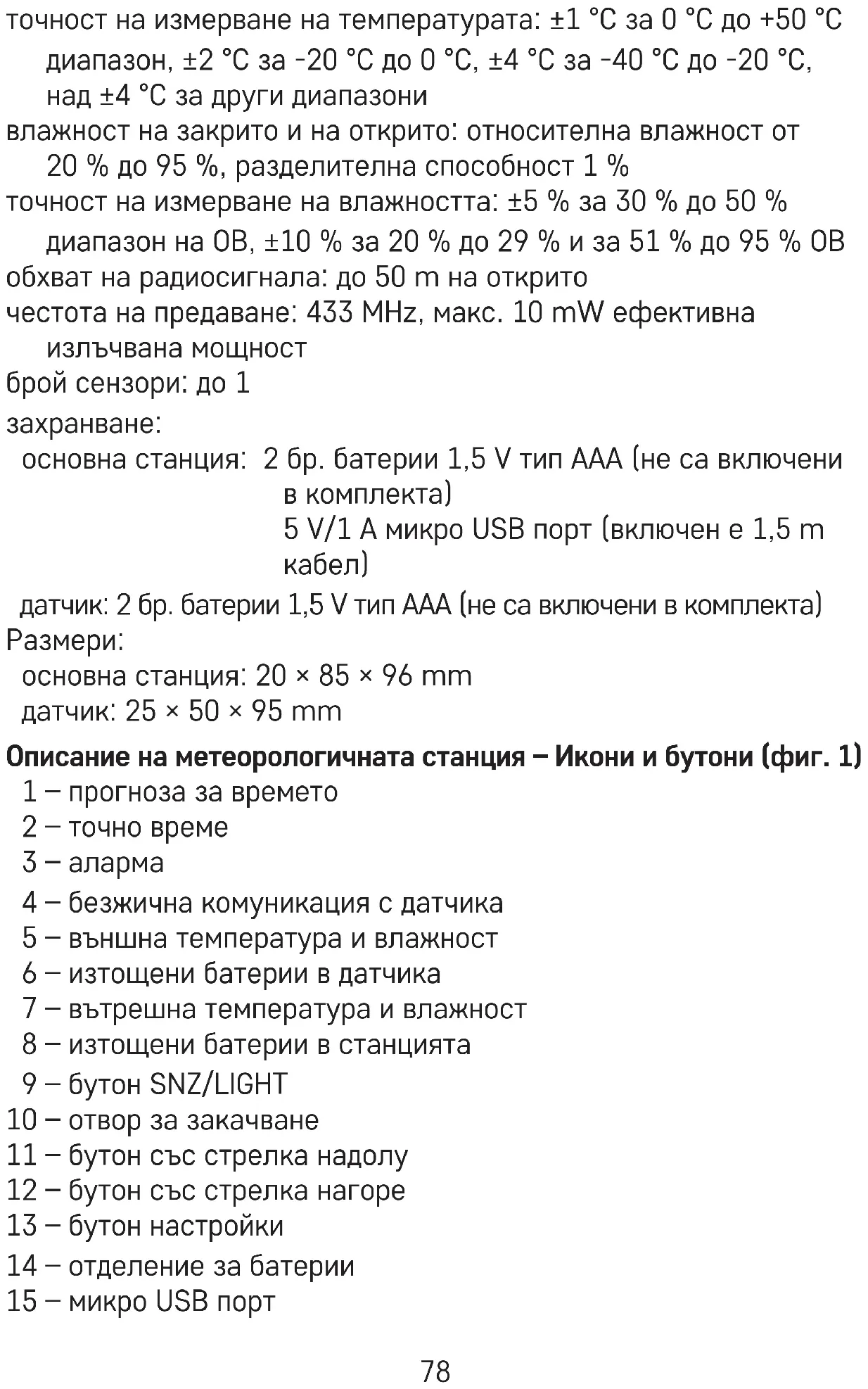 основна станция: 20 × 85 × 96 mm датчик: 25 × 50 × 95 mm Описание на метеорологичната станция – Икони и бутони (фиг. 1) 1 – прогноза за времето 2 – точно време 3 – аларма 4 – безжична комуникация с датчика 5 – външна температура и влажност 6 – изтощени батерии в датчика 7 – вътрешна температура и влажност 8 – изтощени батерии в станцията 9 – бутон SNZ/LIGHT 10 – отвор за закачване 11 – бутон със стрелка надолу 12 – бутон със стрелка нагоре 13 – бутон настройки 14 – отделение за батерии 15 – микро USB порт79 Описание на датчика (фиг. 2) 16 – Светодиод 17 – отвор за закачване 18 – отделение за батерии 19 – бутон RESET