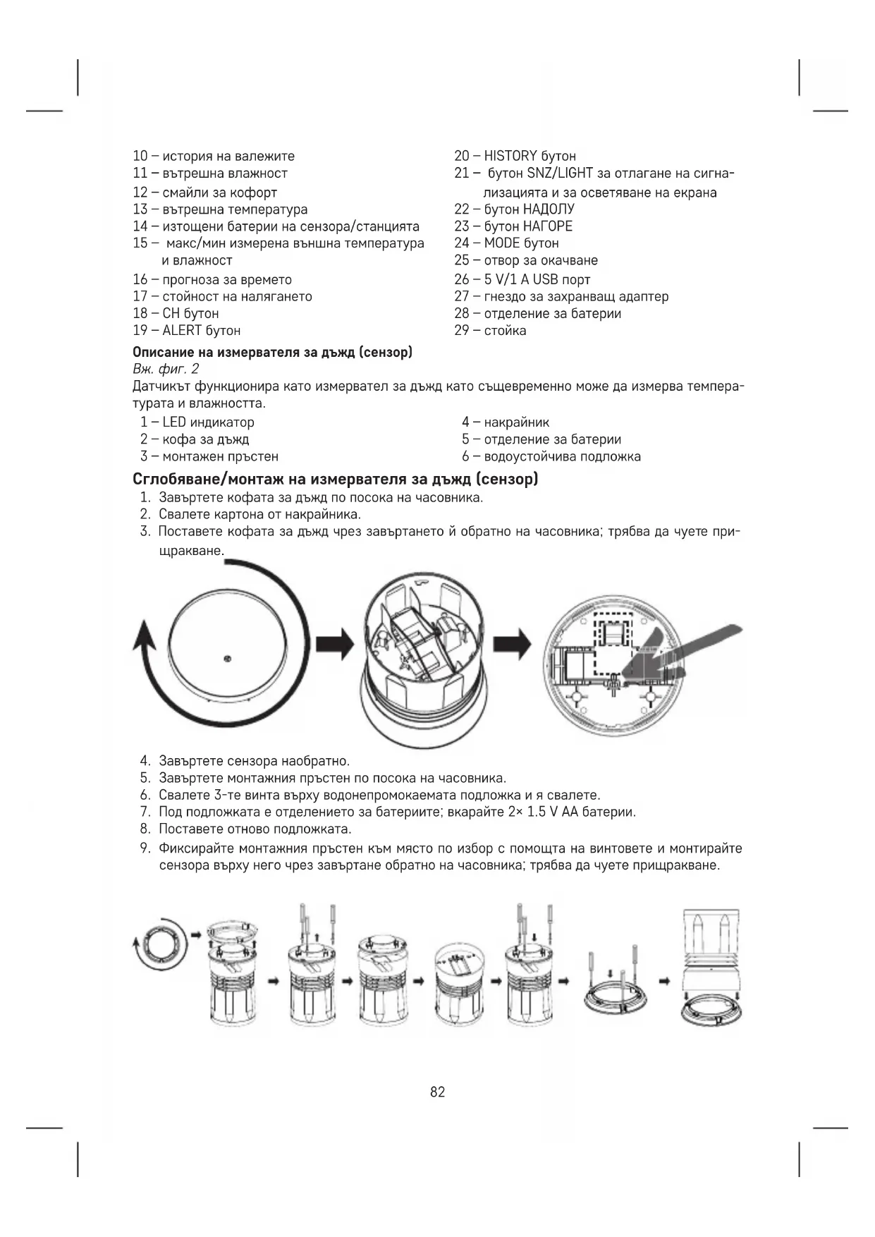 16 – прогноза за времето 17 – стойност на налягането 18 – CH бутон 19 – ALERT бутон 20 – HISTORY бутон 21 – бутон SNZ/LIGHT за отлагане на сигна- лизацията и за осветяване на екрана 22 – бутон НАДОЛУ 23 – бутон НАГОРЕ 24 – MODE бутон 25 – отвор за окачване 26 – 5 V/1 A USB порт 27 – гнездо за захранващ адаптер 28 – отделение за батерии 29 – стойка Описание на измервателя за дъжд (сензор) Вж. фиг. 2 Датчикът функционира като измервател за дъжд като същевременно може да измерва темпера- турата и влажността. 1 – LED индикатор 2 – кофа за дъжд 3 – монтажен пръстен 4 – накрайник 5 – отделение за батерии 6 – водоустойчива подложка Сглобяване/монтаж на измервателя за дъжд (сензор)