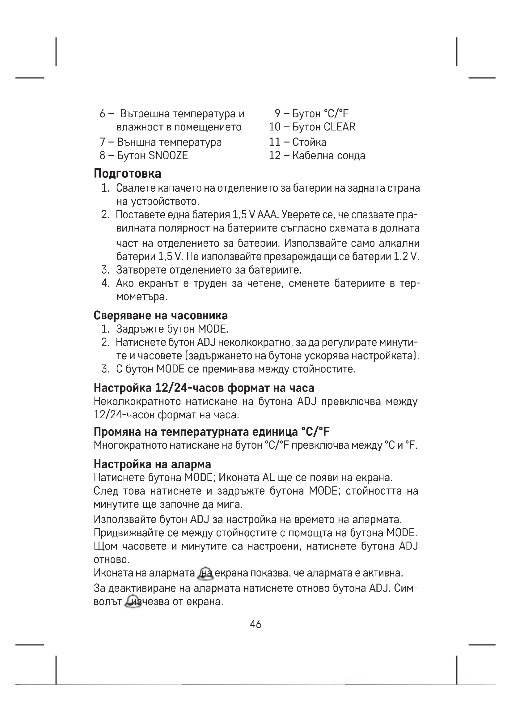 Настройка 12/24-часов формат на часа Неколкократното натискане на бутона ADJ превключва между 12/24-часов формат на часа. Промяна на температурната единица °C/°F Многократното натискане на бутон °C/°F превключва между °C и °F. Настройка на аларма Натиснете бутона MODE; Иконата AL ще се появи на екрана. След това натиснете и задръжте бутона MODE; стойността на минутите ще започне да мига. Използвайте бутон ADJ за настройка на времето на алармата. Придвижвайте се между стойностите с помощта на бутона MODE. Щом часовете и минутите са настроени, натиснете бутона ADJ