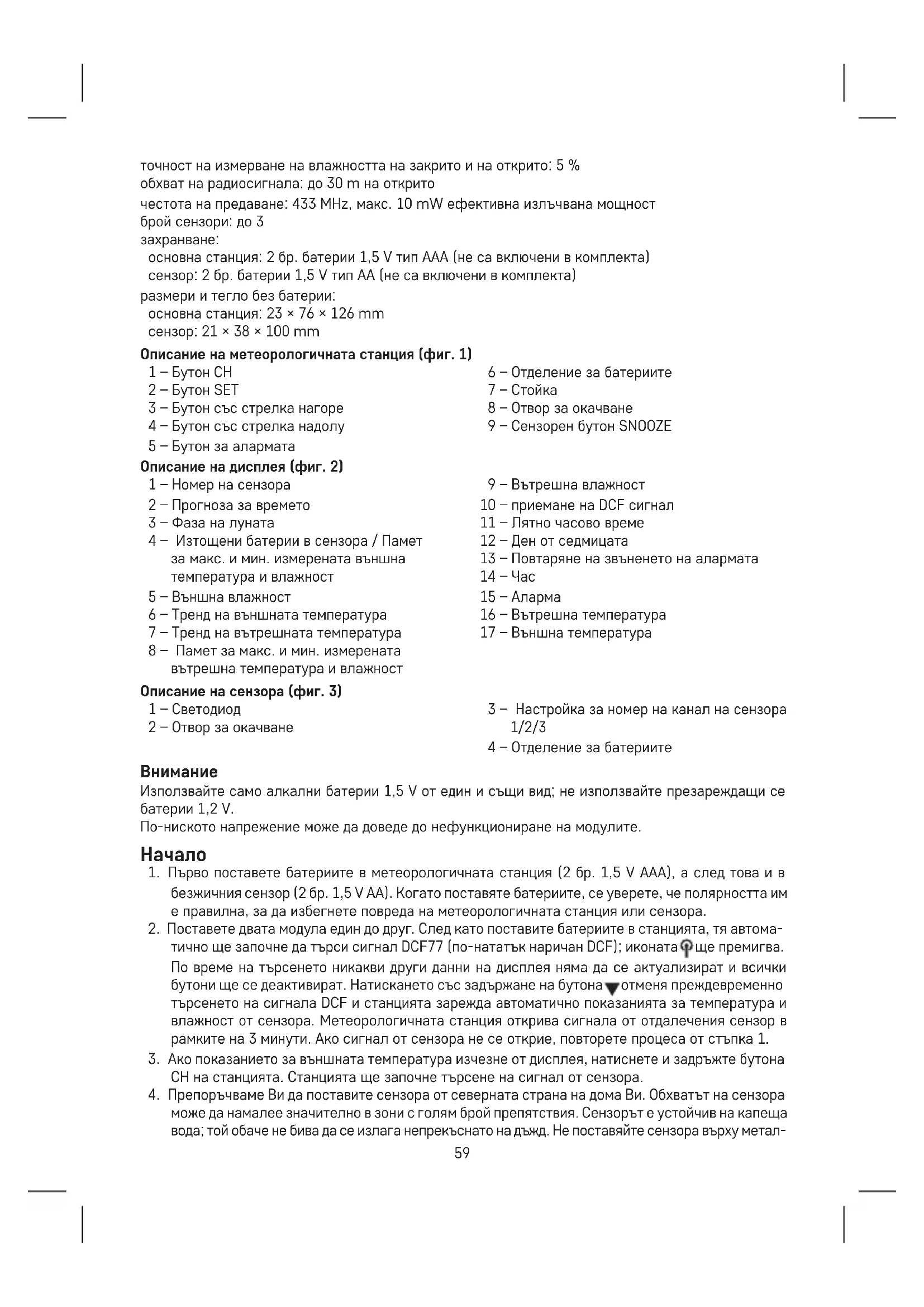 безжичния сензор (2 бр. 1,5 V AA). Когато поставяте батериите, се уверете, че полярността им е правилна, за да избегнете повреда на метеорологичната станция или сензора.