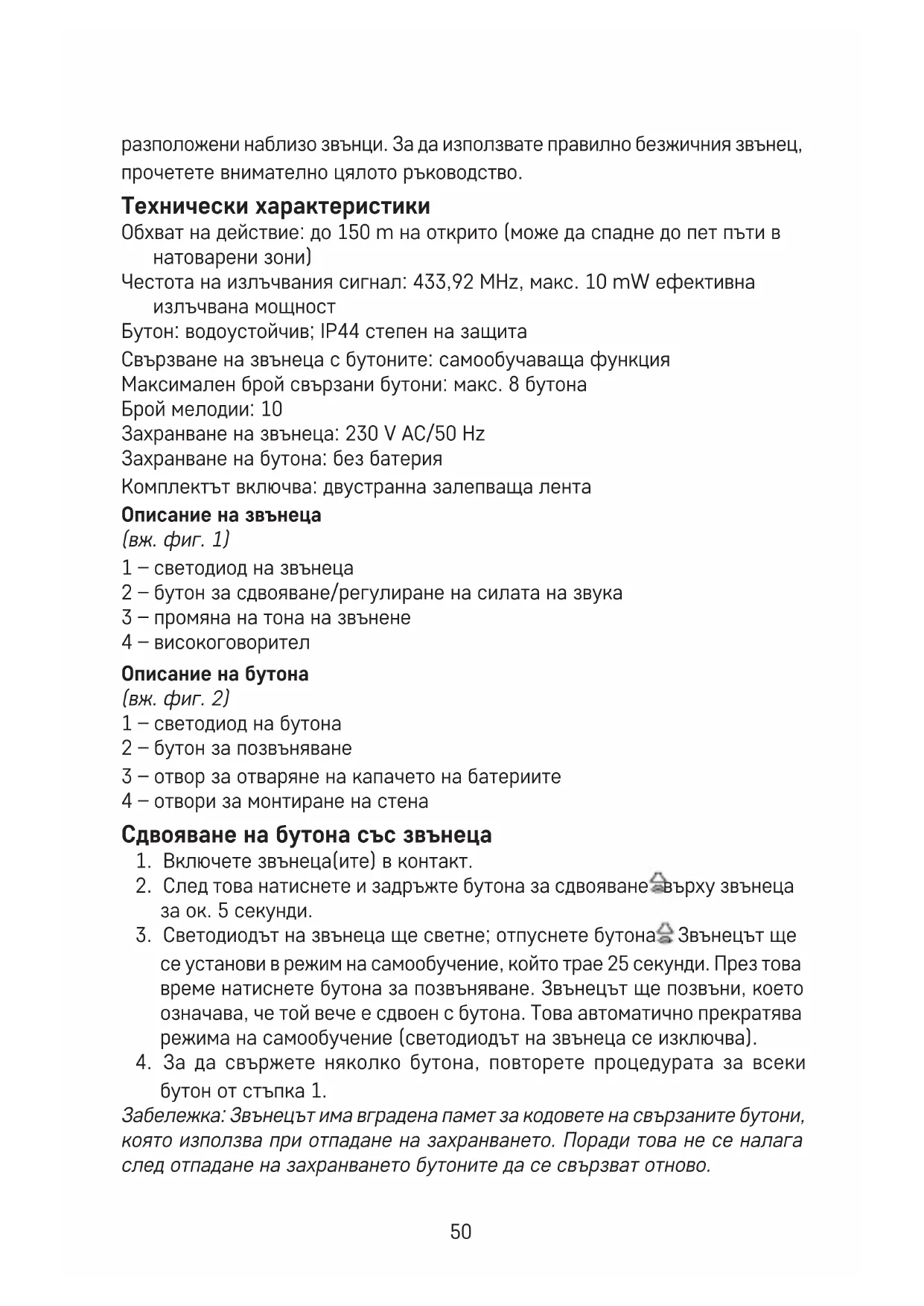 - Звънецът (приемникът) е предназначен за използване само на закрито, в сухи помещения.