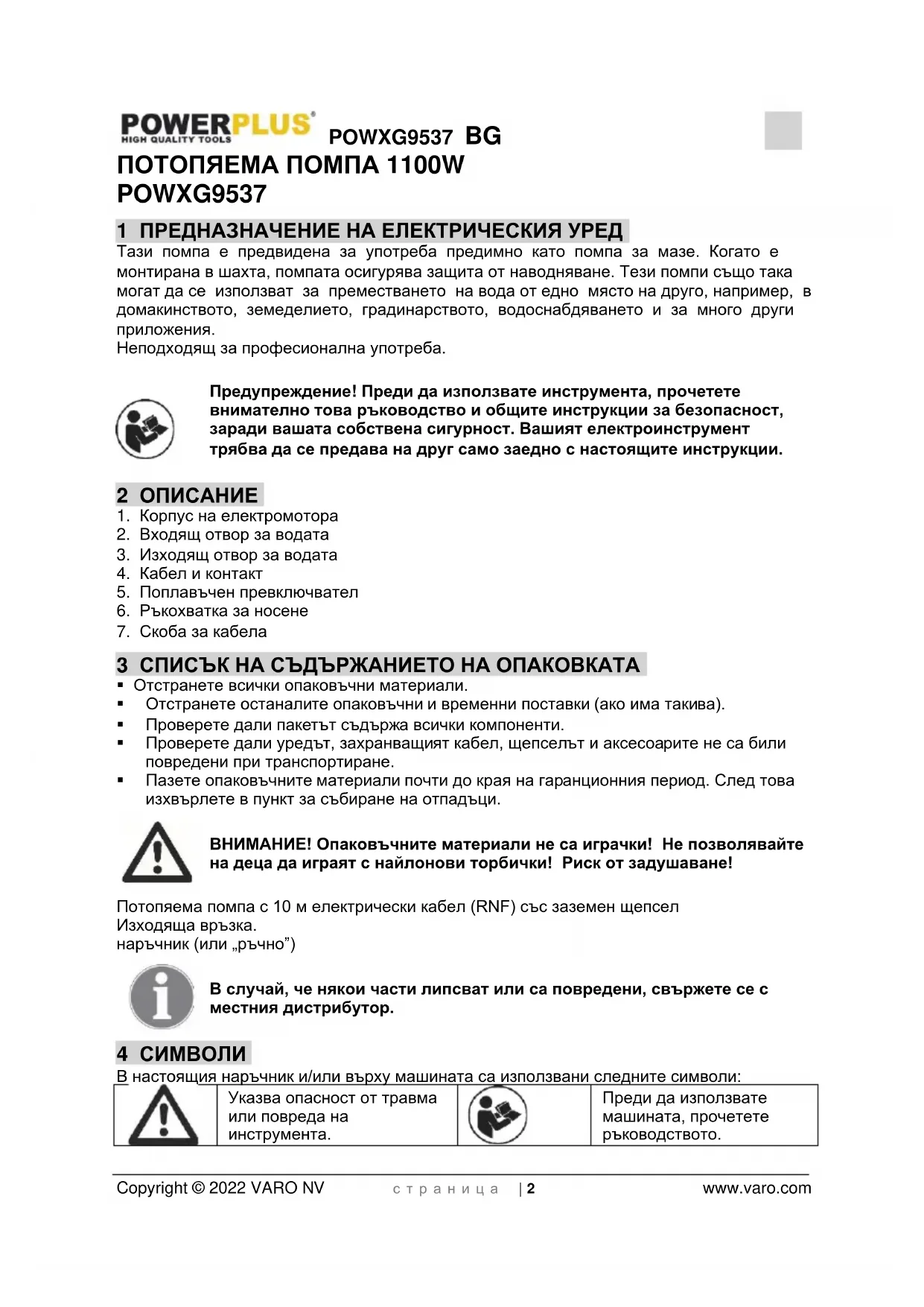 - 16 ДЕКЛАРАЦИЯ ЗА СЪОТВЕТСТВИЕ POWXG9537 BG Copyright © 2022 VARO NV с т р а н и ц а | 2 www.varo.com ПОТОПЯЕМА ПОМПА 1100W POWXG9537 1 ПРЕДНАЗНАЧЕНИЕ НА ЕЛЕКТРИЧЕСКИЯ УРЕД Тази помпа е предвидена за употреба предимно като помпа за мазе. Когато е монтирана в шахта, помпата осигурява защита от наводняване. Тези помпи също така могат да се използват за преместването на вода от едно място на друго, например, в домакинството, земеделието, градинарството, водоснабдяването и за много други приложения. Неподходящ за професионална употреба. Предупреждение! Преди да използвате инструмента, прочетете внимателно това ръководство и общите инструкции за безопасност, заради вашата собствена сигурност. Вашият електроинструмент трябва да се предава на друг само заедно с настоящите инструкции. 2 ОПИСАНИЕ p. 8